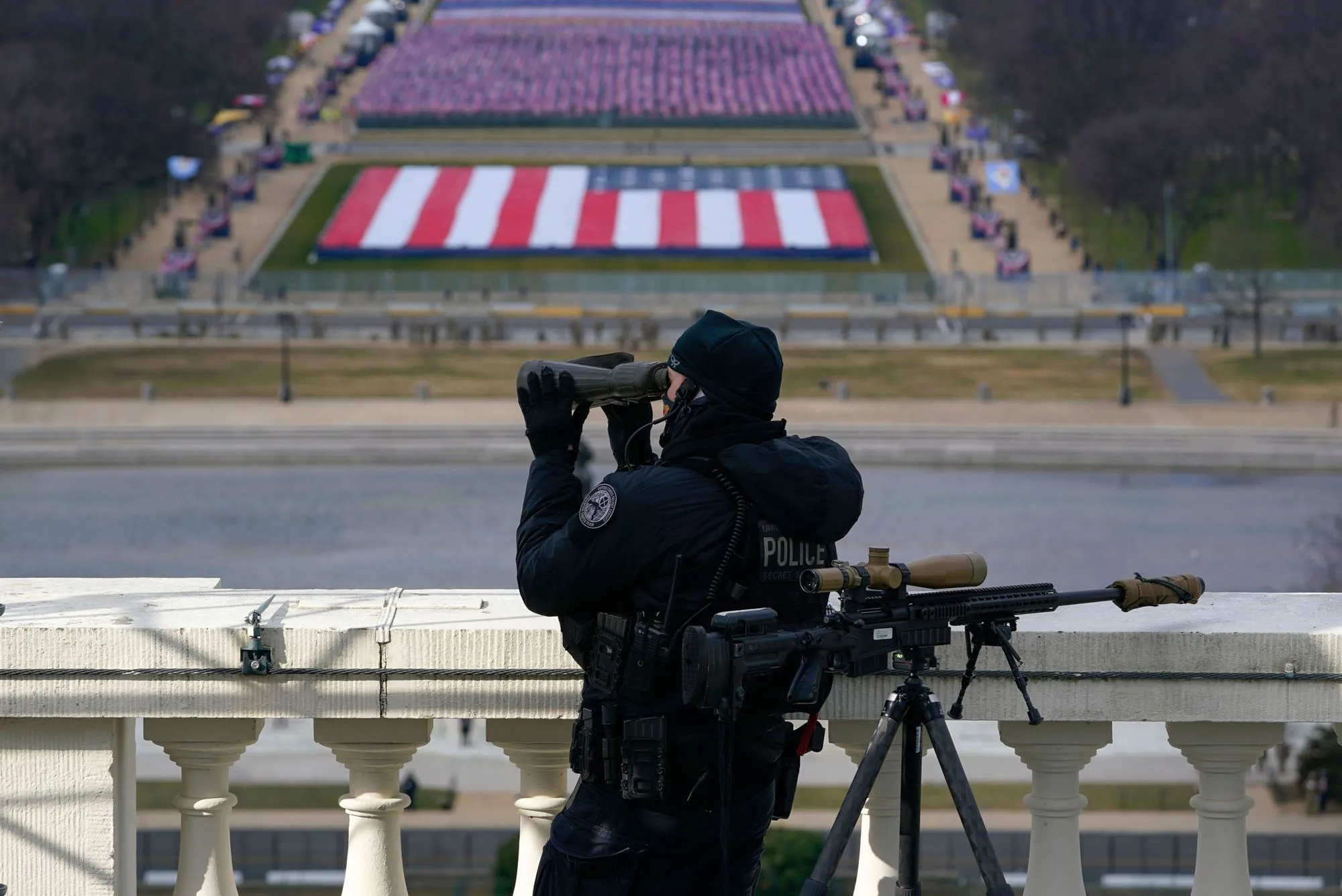 A law enforcement personnel monitor from a balcony in Washington, DC, on January 20, 2021, during the inauguration of US President-elect Joe Biden and Vice President-elect Kamala Harris. (Photo by Susan Walsh/Pool via AFP Photo)