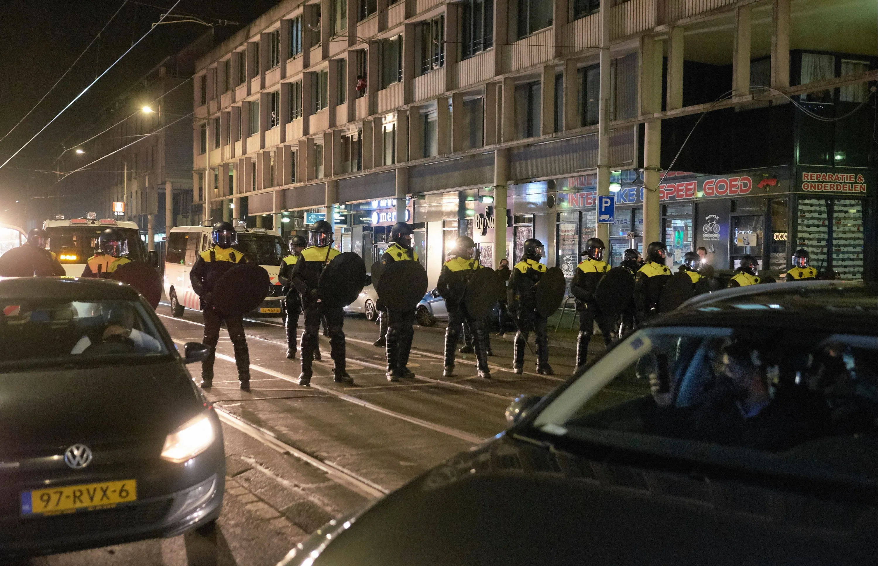 Anti riot forces gather as groups of local youth gather on the streets of Schilderswijk for a second day on January 25, 2021 in The Hague, Netherlands. A curfew has been imposed from 9 PM to 4:30 AM to curve the growing number of Coronavirus infections. Over 200 people were detained after Sunday's protest saw demonstrators clash with police, who deployed water cannon to disperse crowds. (Photo by Pierre Crom/Getty Images)