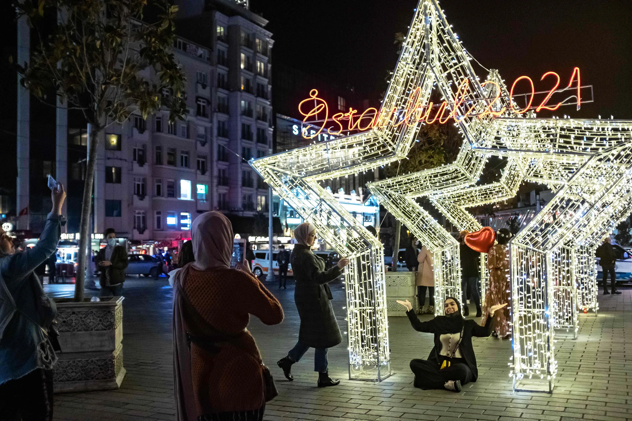 A Turkish woman poses for photographs on Taksim Square during the new year's celebrations in Istanbul on December 31, 2020. Turkish government announced a four-days lockdown between December 31 and January 04, 2021. (Photo by Yasin Akgul/AFP Photo)