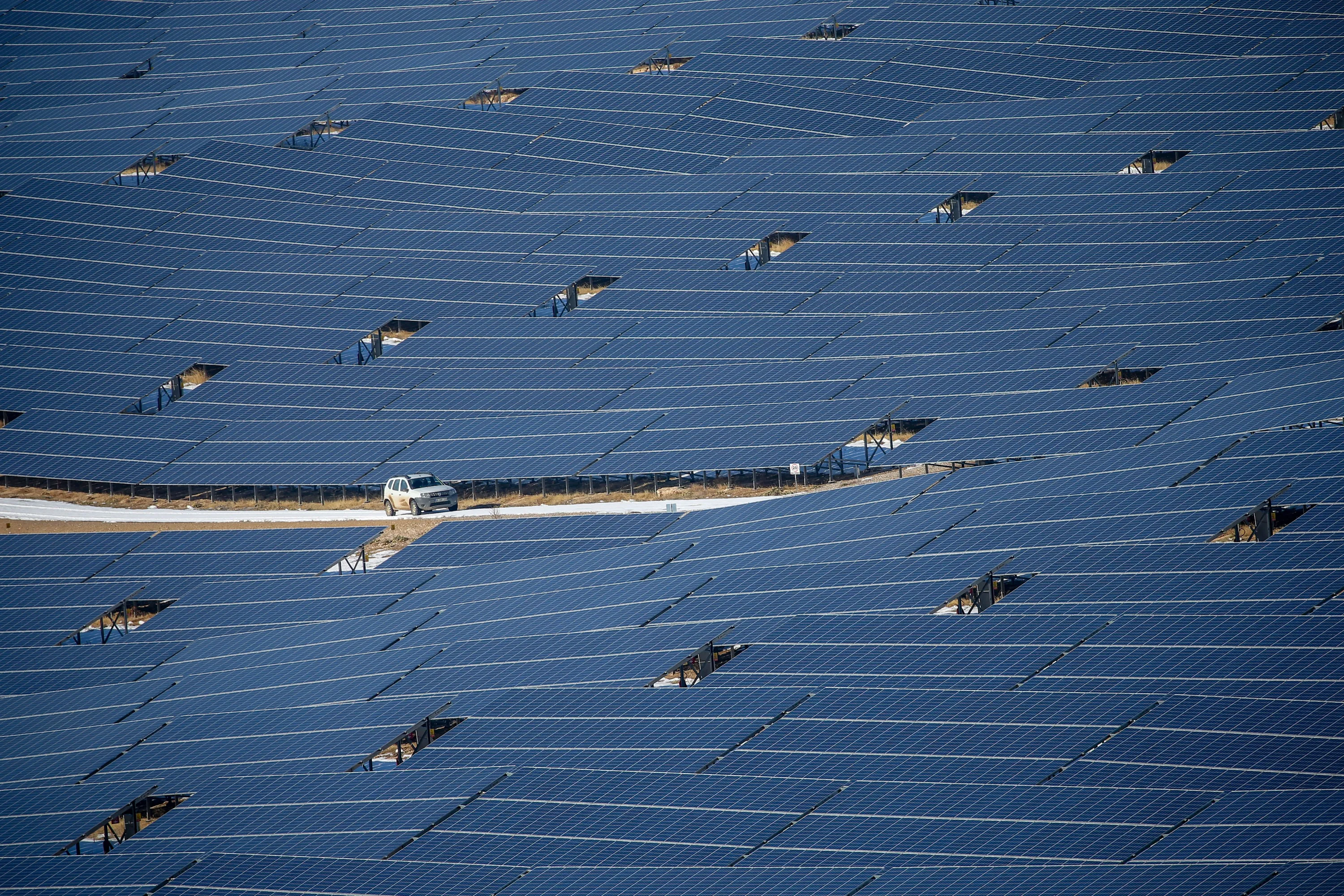 A drone photo shows an aerial view of solar panels at a solar energy power plant (GES) in Edremit district of Van, Turkey on January 6, 2021. Van becomes one of the major markets of the country in electric generation from the sun with 37 megawatts of total capacity solar energy power plant to supply power to 80 thousand households. (Photo by Ozkan Bilgin/Anadolu Agency via Getty Images)
