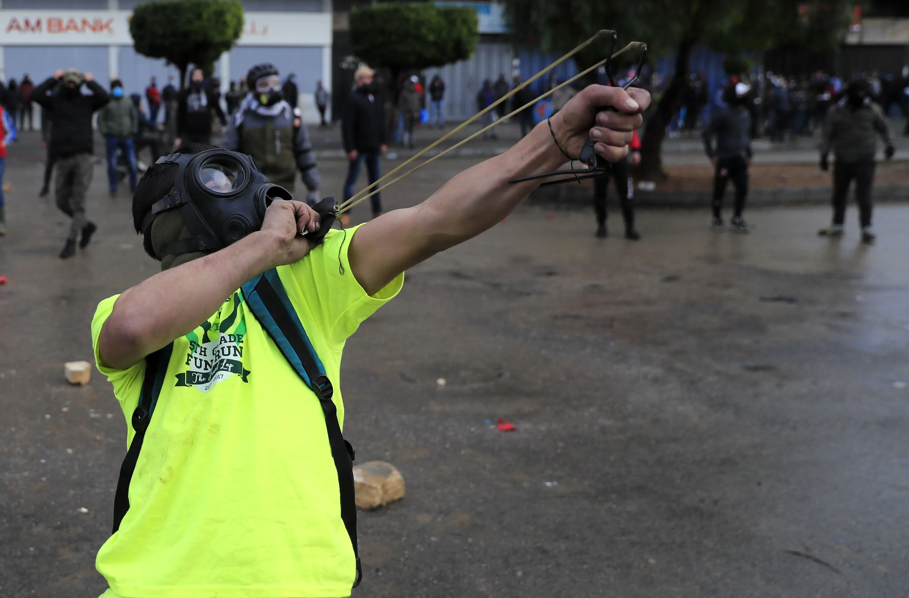 A protester fires a slingshot towards riot policemen during a protest against deteriorating living conditions and strict coronavirus lockdown measures, in Tripoli, north Lebanon, Thursday, January 28, 2021. Violent confrontations for three straight days between protesters and security forces in northern Lebanon left a 30-year-old man dead and more than 220 people injured, the state news agency said Thursday. (Photo by Hussein Malla/AP Photo)