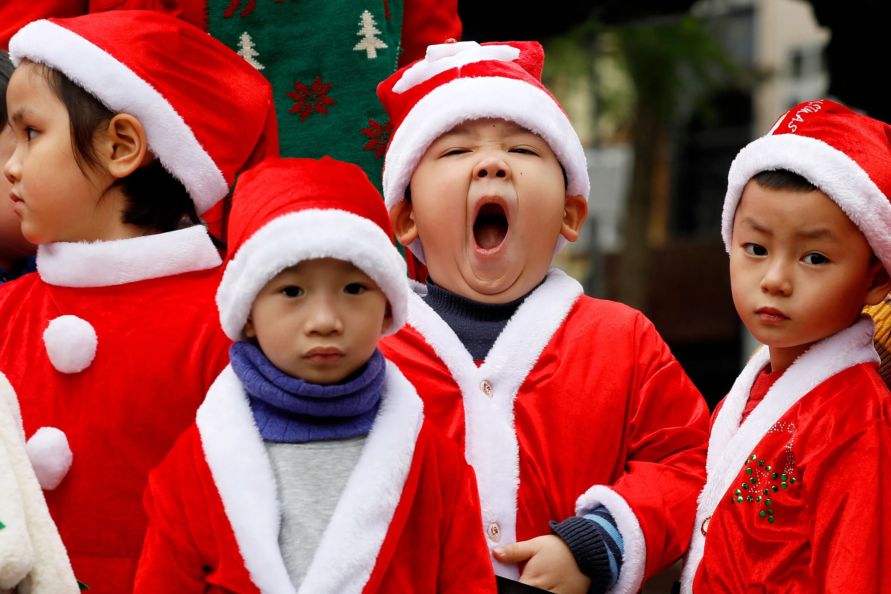 Children wearing Santa Claus outfits visit a church in Hanoi, Vietnam, 21 December 2020. Although Christmas is not an official holiday in Vietnam, it has seen an increase in popularity with festive activities held during Christmas period in the nation. (Photo by Luong Thai Linh/EPA/EFE)