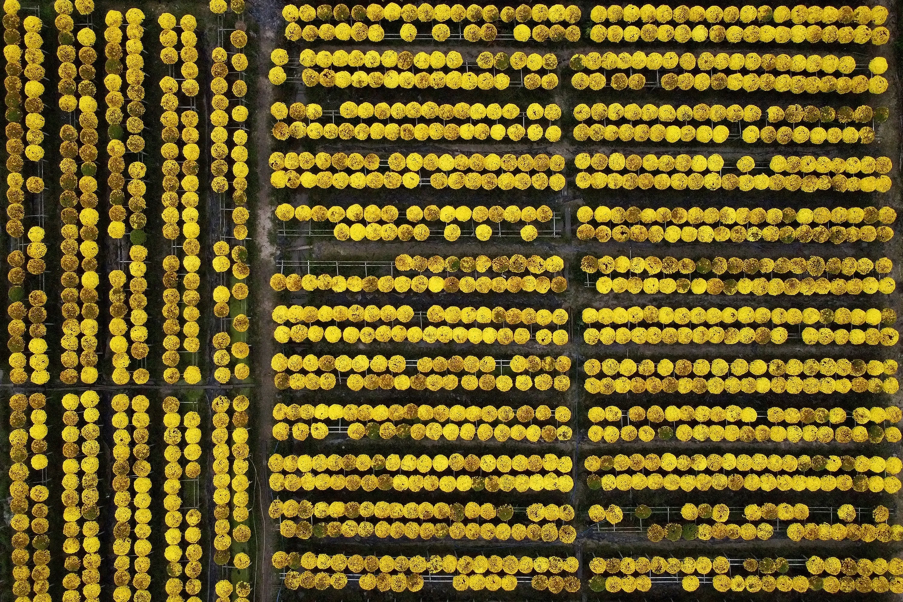 This aerial photograph shows flowers in a field at the Sa Dec flower village, largest flower supplier in southern Vietnam's Mekong Delta region on January 22, 2021, ahead of Lunar New Year or Tet celebrations. (Photo by Manan Vatsyayana/AFP Photo)