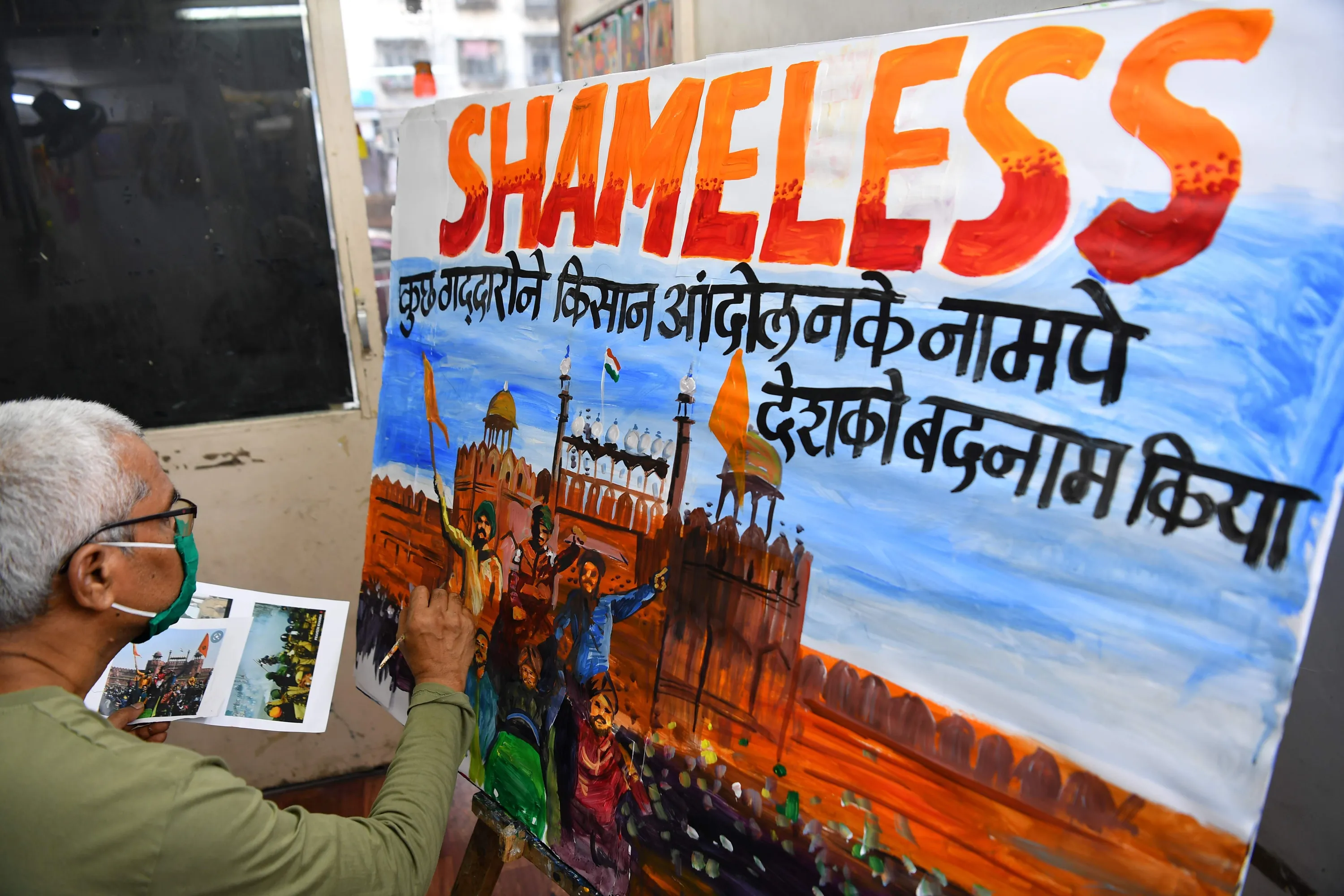 A school teacher paints a depiction of the Red Fort to condemn the violence a day after farmers went on the rampage in the capital, leaving one person dead and dozens injured, in Mumbai on January 27, 2021. (Photo by Indranil Mukherjee/AFP Photo)
