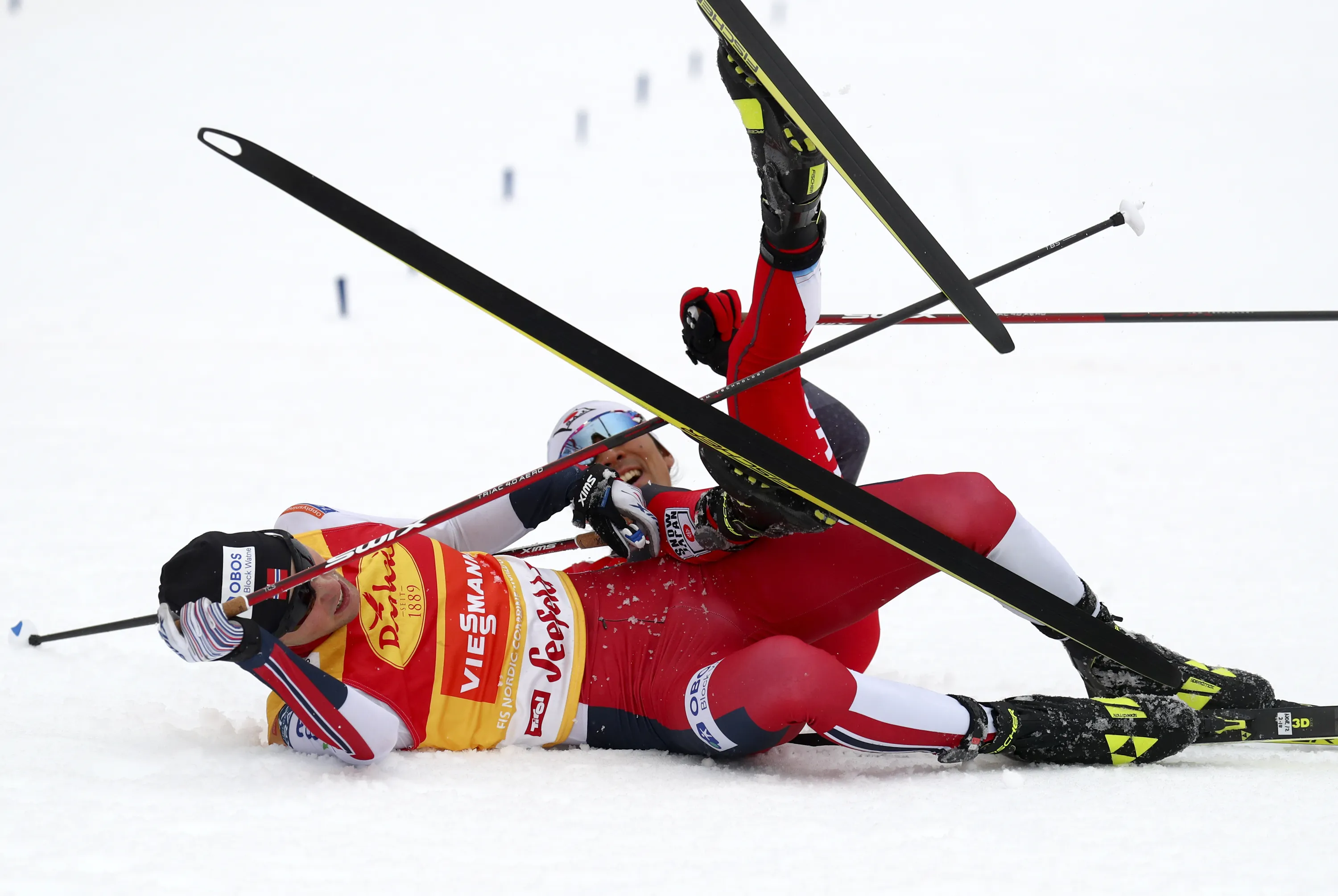 Jarl Magnus Riiber of Norway, foreground, and Akito Watabe of Japan lie on the ground after crossing the finish line during the men's Individual Gundersen NH 5km ski jumping competition at the Nordic Combined World Cup in the Austrian province of Tyrol, in Seefeld, Austria, Friday, January 29, 2021. (Photo by Matthias Schrader/AP Photo)