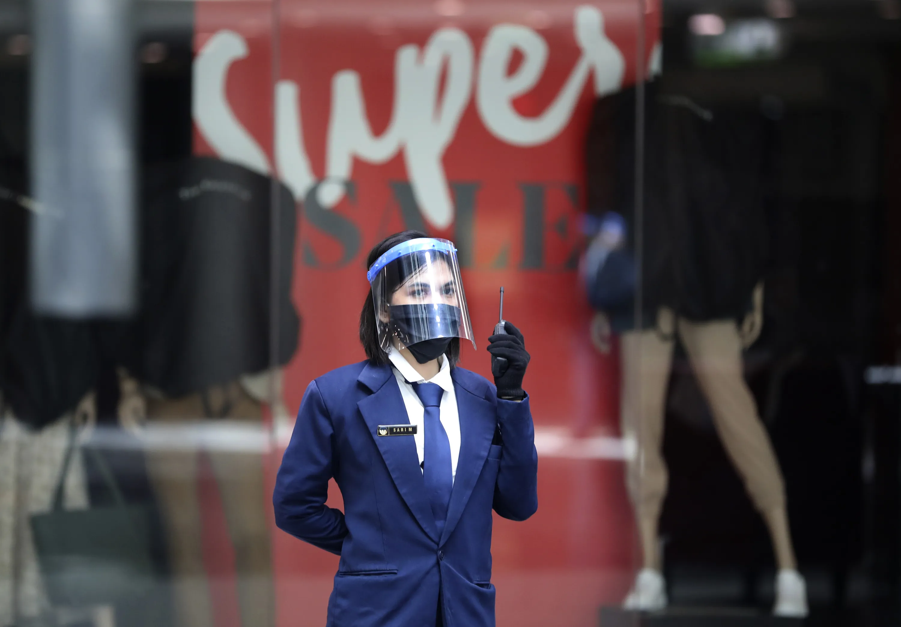 A security guard wearing a protective face shield as a precaution against coronavirus outbreak talks on her radio at Margo City shopping mall, which has been closed after a number of employees of a supermarket at the mall were tested positive for the virus, in Depok, Indonesia, Saturday, August 22, 2020. (Photo by Dita Alangkara/AP Photo)
