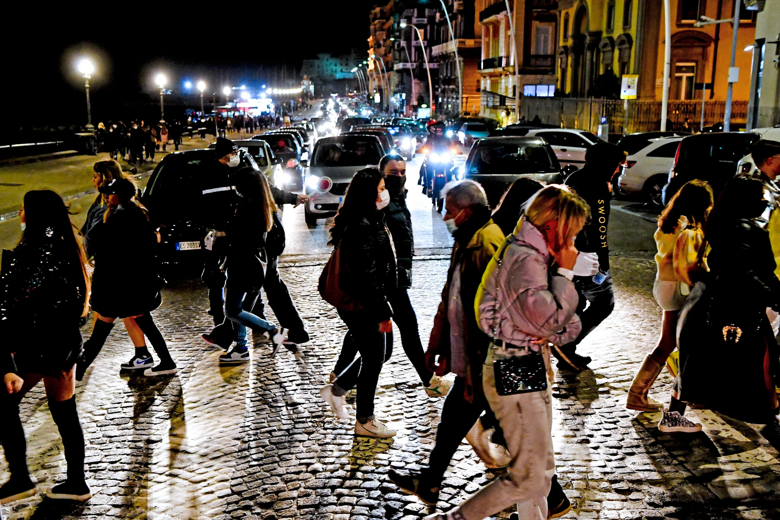 Traffic and crowds of pedestrians in the street at the weekend in Naples, southern Italy (issued 01 February 2021). Regions across Italy have entered the yellow zone with the lowest level of restrictions as of 01 February. In yellow zones, shops are allowed to open and restaurants and bars can serve customers until 6pm, after which time they can only do takeaway and delivery services. (Photo by Ciro Fusco/EPA/EFE)