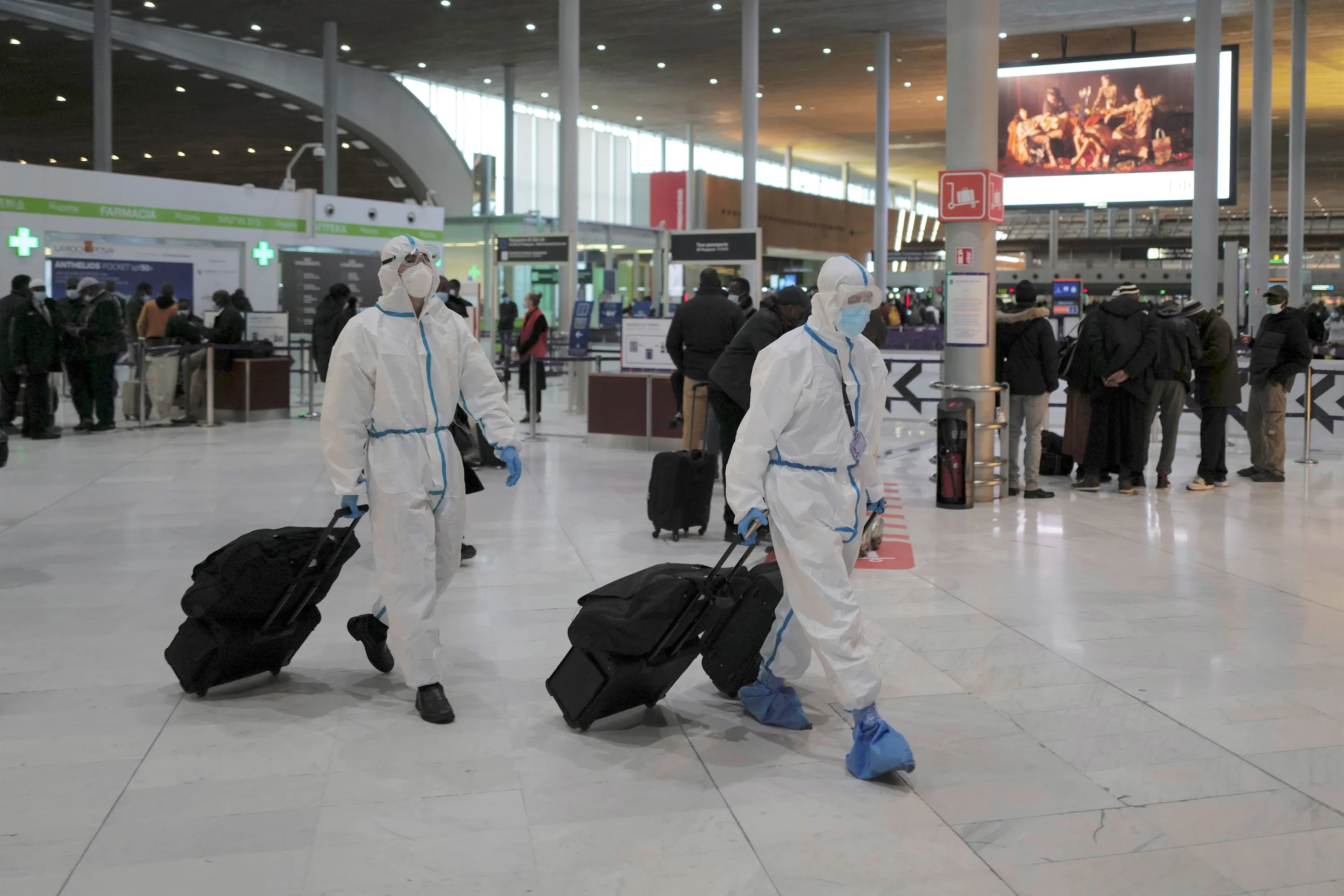 Passengers from Taiwan wearing protective gear arrive to board their plane at Paris Charles de Gaulle Airport in Roissy , north of Paris, Monday, February 1, 2021. France says it's closing its borders to people arriving from outside the European Union starting Sunday to try to stop the growing spread of new variants of the virus and avoid a third lockdown. (Photo by Francois Mori/AP Photo)