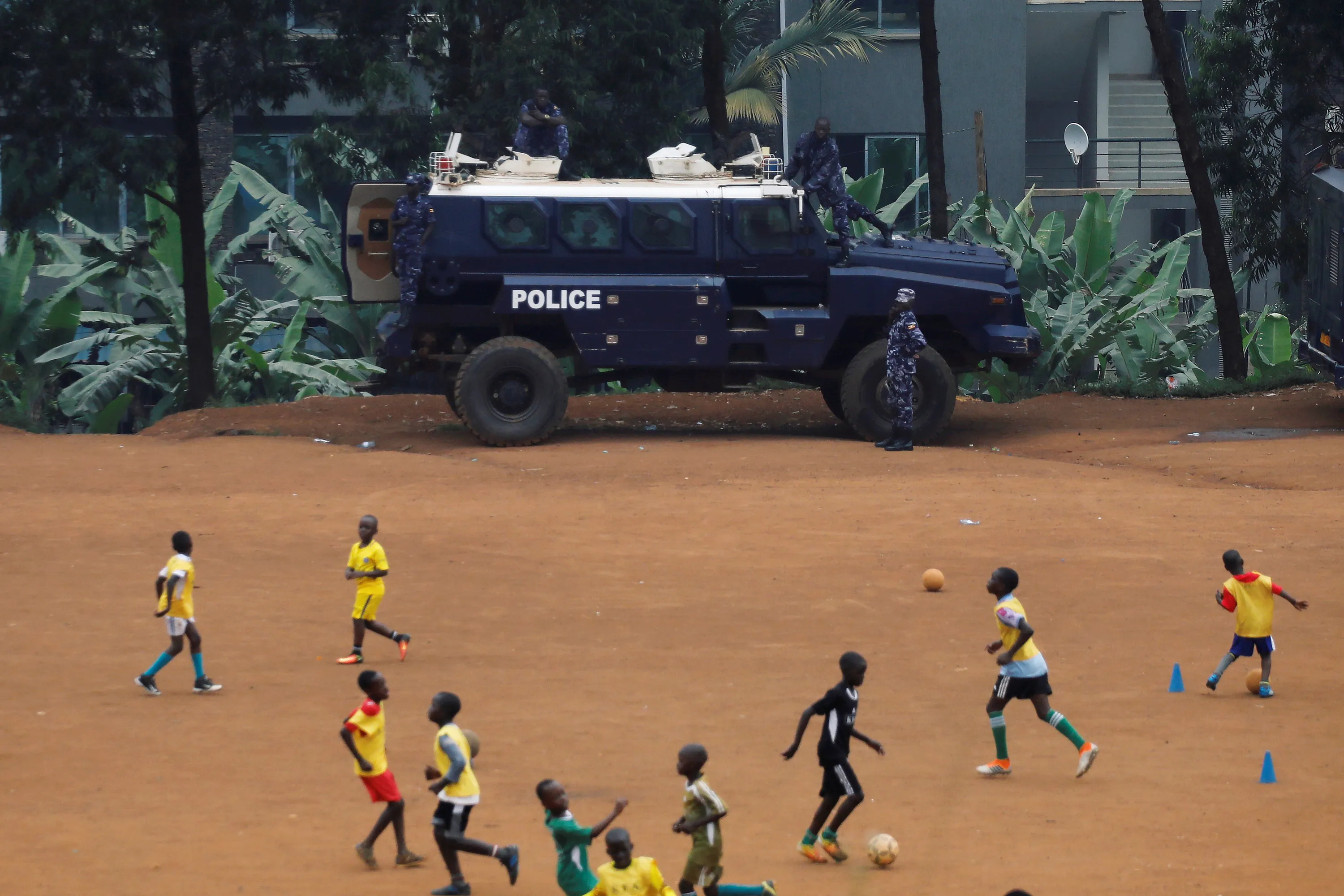 An Ugandan police APC (Armoured Personnel Carrier) is parked on a soccer field in Kampala, Uganda on January 18, 2021. (Photo by Baz Ratner/Reuters)