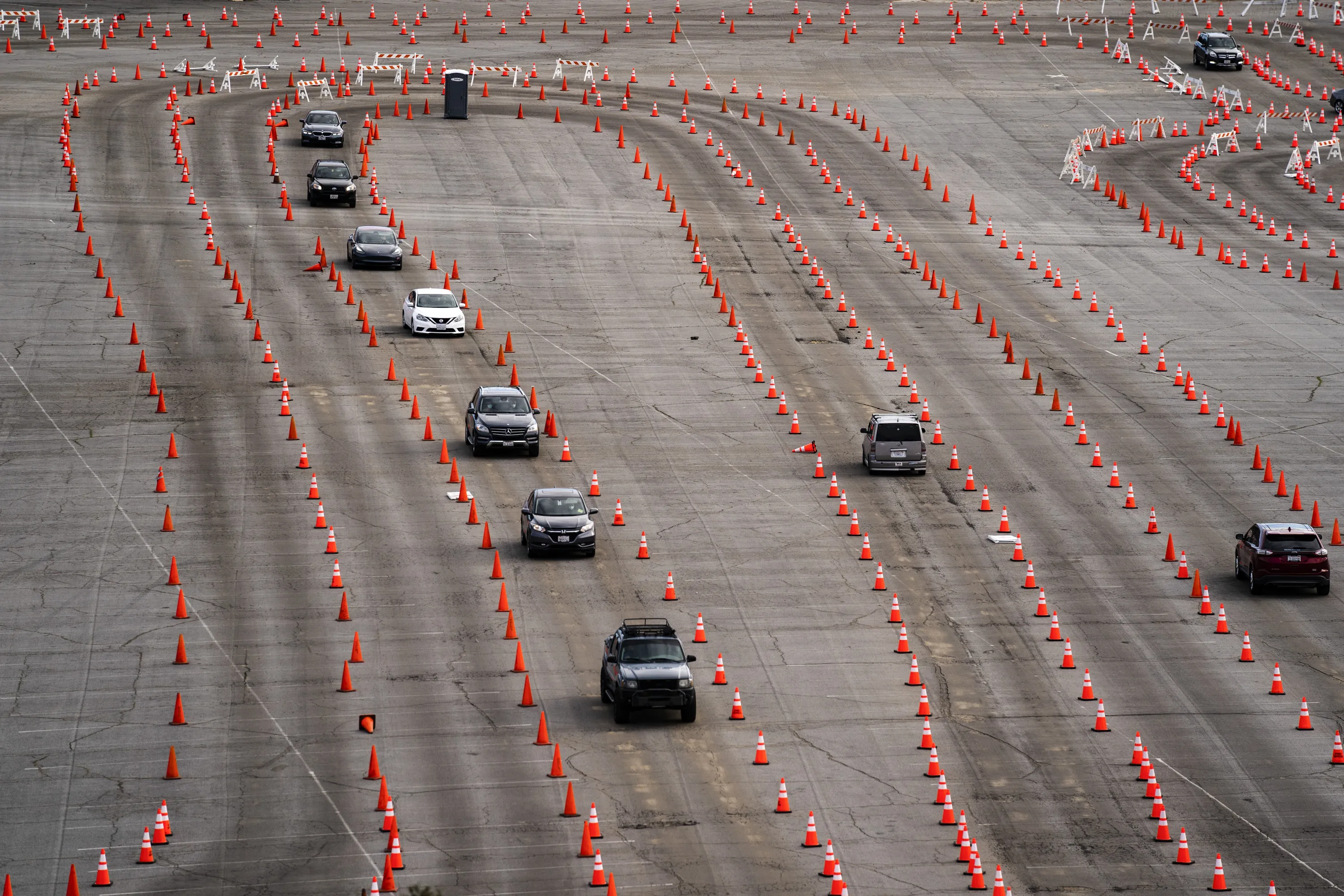 Traffic cones guide drivers into a mega COVID-19 vaccination site set up in the parking lot of Dodger Stadium in Los Angeles, Wednesday, January 27, 2021. California is changing up the way it is delivering coronavirus vaccines, moving to a more centralized system that is expected to streamline appointment sign-up, notification, and eligibility for nearly 40 million residents who want to know when they can get a shot and where. (Photo by Jae C. Hong/AP Photo)