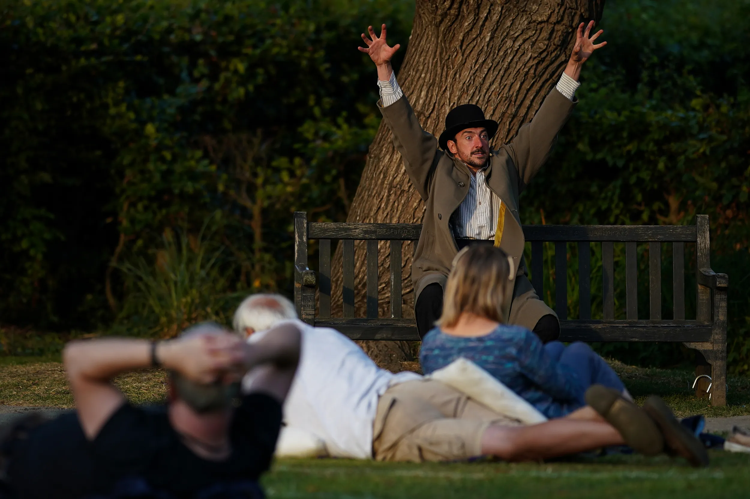 Actor Chris Hannon from the Park Bench Theatre performs Samuel Beckett’s “First Love” during an open air play in a socially distanced covid secure space in Rowntree Park on August 12, 2020 in York, England. As coronavirus lockdown restrictions are eased in many areas, the theatre and the arts sectors begin to re-start their businesses. “First Love” is a short story by Samuel Beckett, written in 1946 and first published in its original French version in 1970 and, in Beckett's English translation, in 1973. The Park Bench Theatre season is being presented by Engine House Theatre. (Photo by Ian Forsyth/Getty Images)