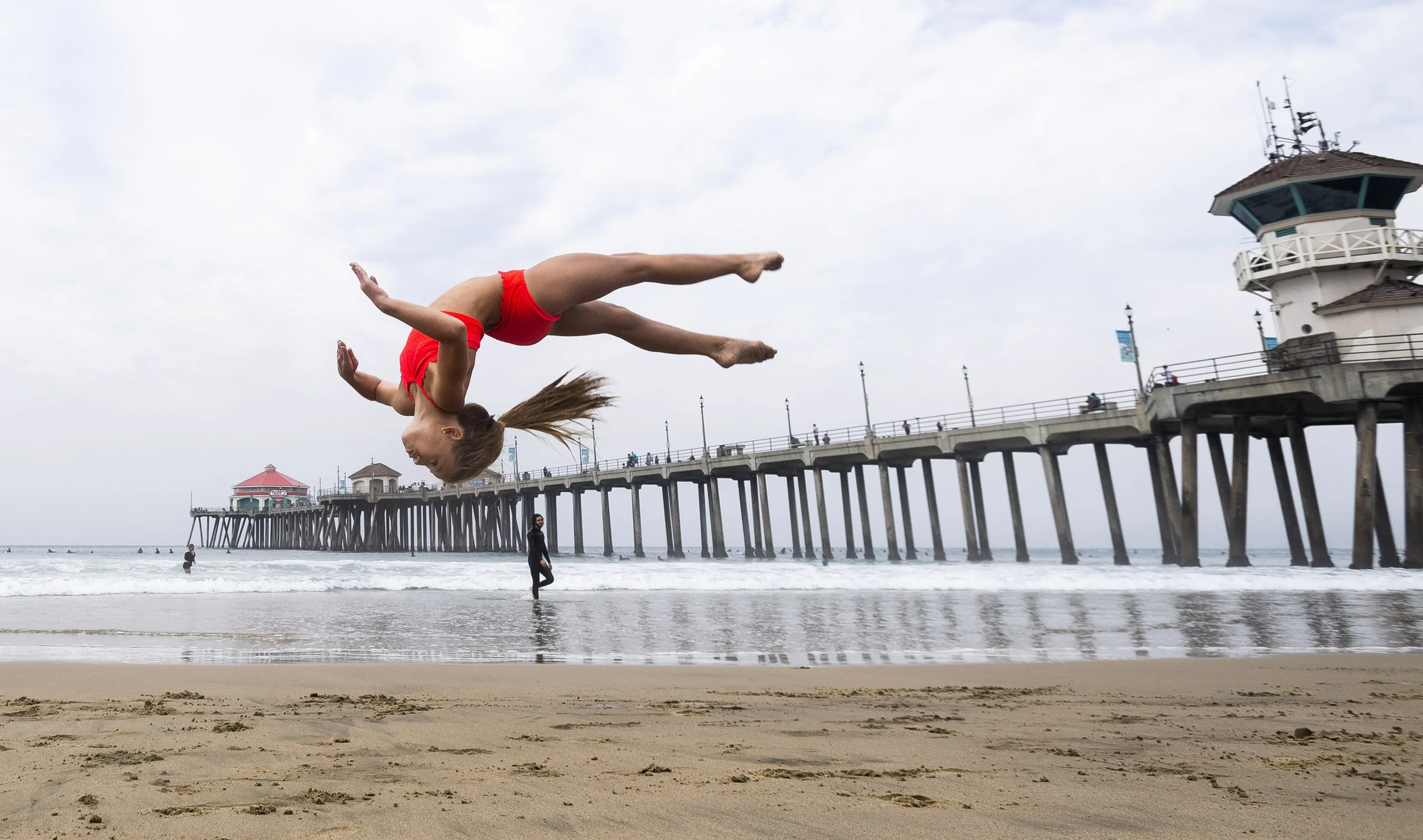 A student works on her skills during an acrobatics class near the pier in Huntington Beach, CA on Monday, August 17, 2020. Instructors at the Orange County Performing Arts Academy decided to bring the class to the beach from Anaheim Hills to beat the heat and give the students an end of the summer treat. (Photo by Paul Bersebach/The Orange County Register via AP Photo)