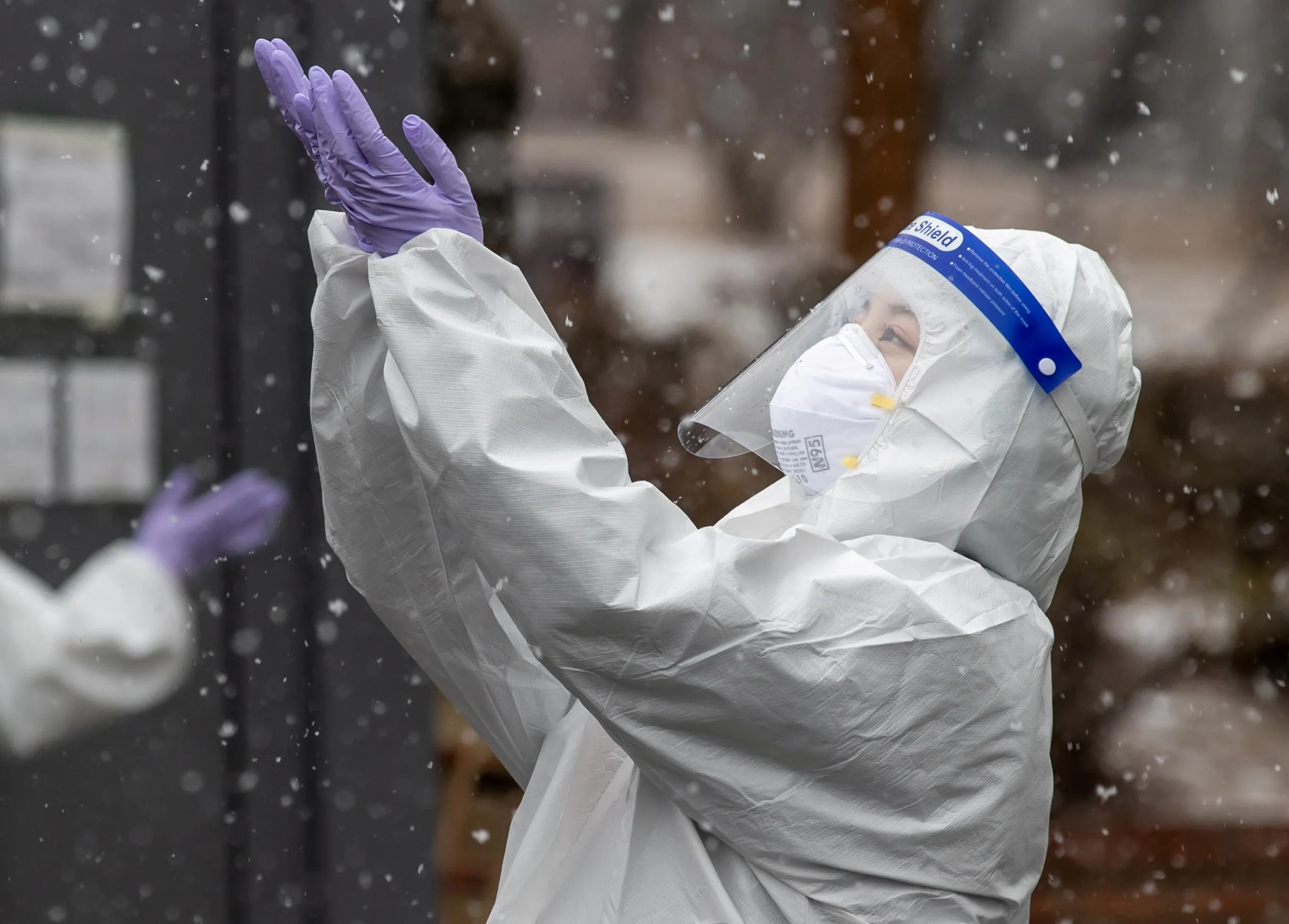 A health worker wearing a protective suit enjoys the falling snow at a coronavirus testing site in Seoul, South Korea on January 12, 2021. (Photo by Yonhap via Reuters)