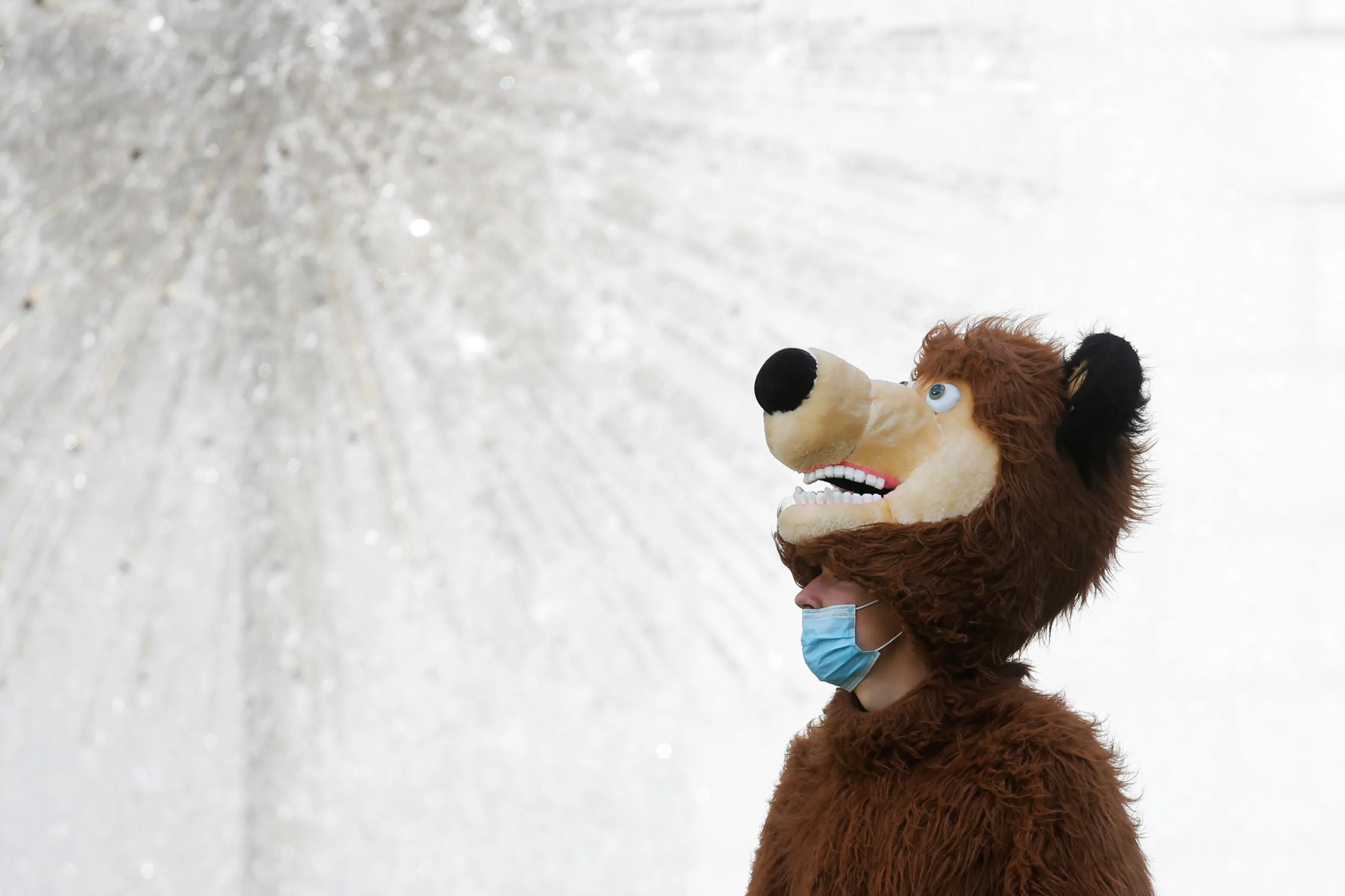 A man dressed as a bear and wearing a protective face mask amid the outbreak of the coronavirus disease (COVID-19) stands in front of a fountain in central Kyiv, Ukraine on August 11, 2020. (Photo by Valentyn Ogirenko/Reuters)