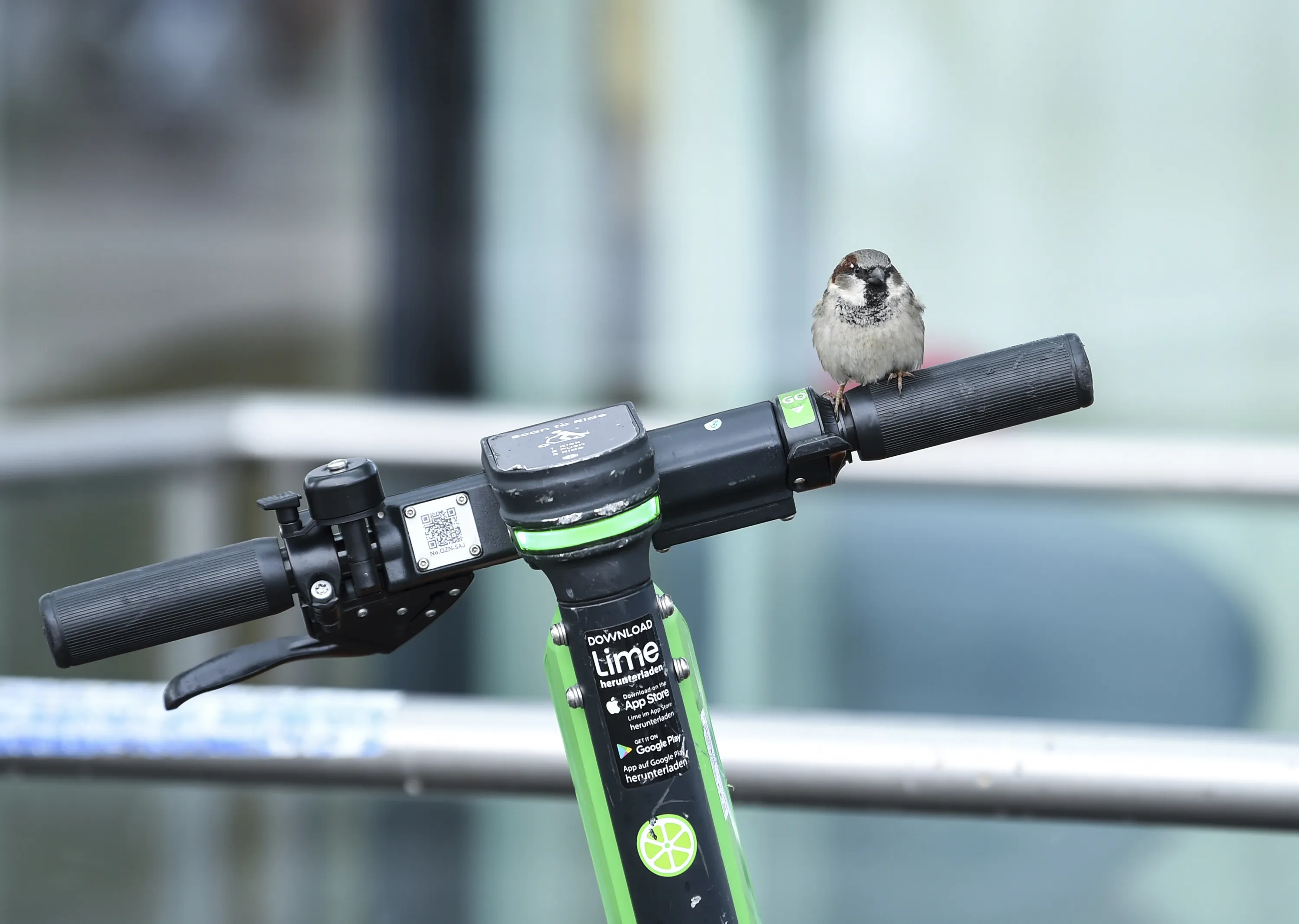 A sparrow sits on the handlebars of an e-scooter at Berlin's Ostbahnhof station on January 6, 2021. (Photo by Kira Hofmann/dpa-Zentralbild/dpa)