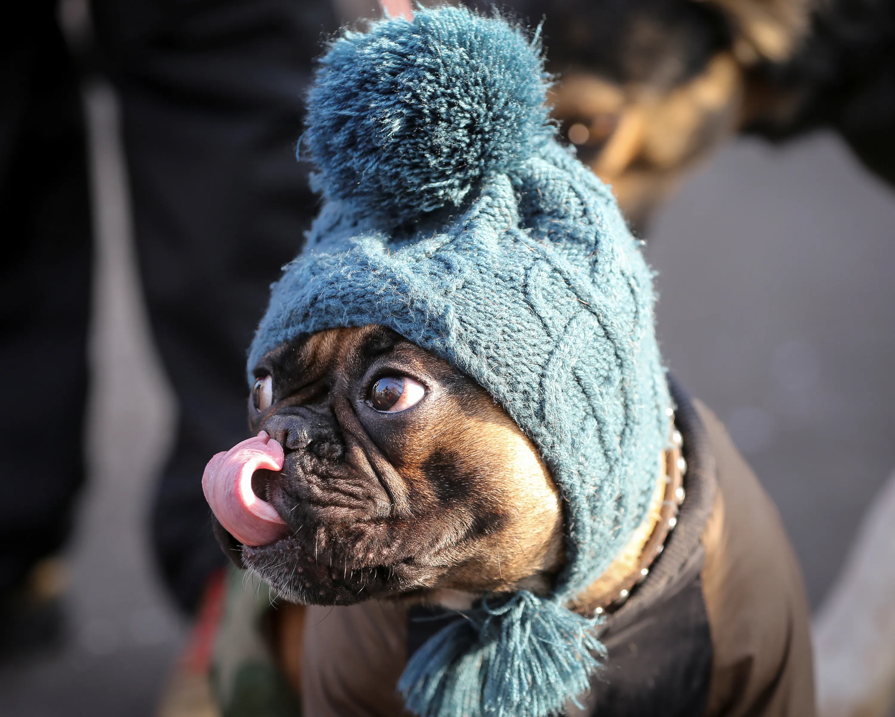 A dog licks its nose during a protest of animals rights activists demanding to toughen up the punishment for animal abuse in Almaty, Kazakhstan on November 21, 2020. (Photo by Pavel Mikheyev/Reuters)