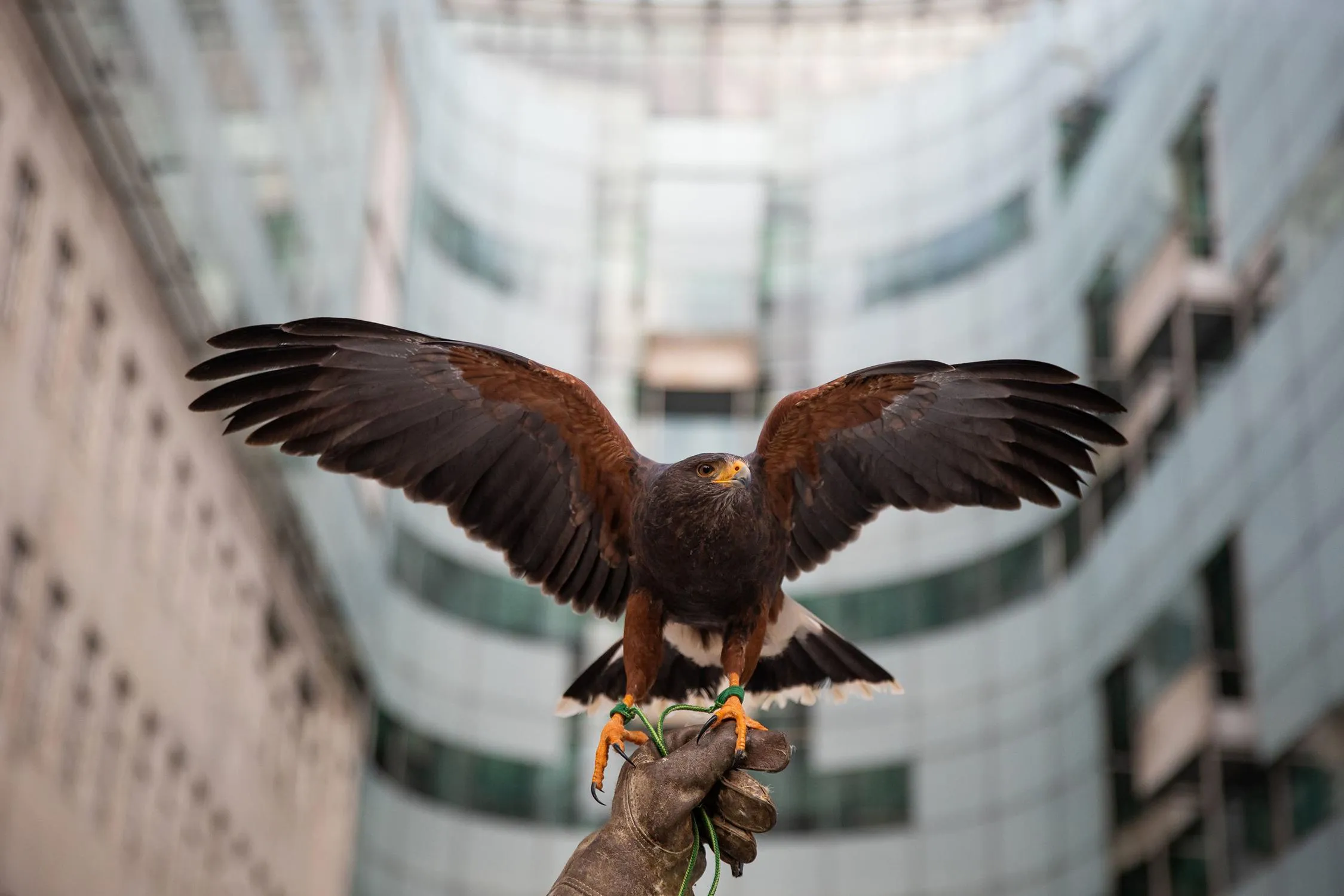 A Harris's hawk named Lightning is held by Matt from pest control firm City Hawks in front of the BBC's New Broadcasting House, London on January 15, 2021. (Photo by Aaron Chown/PA Images via Getty Images)