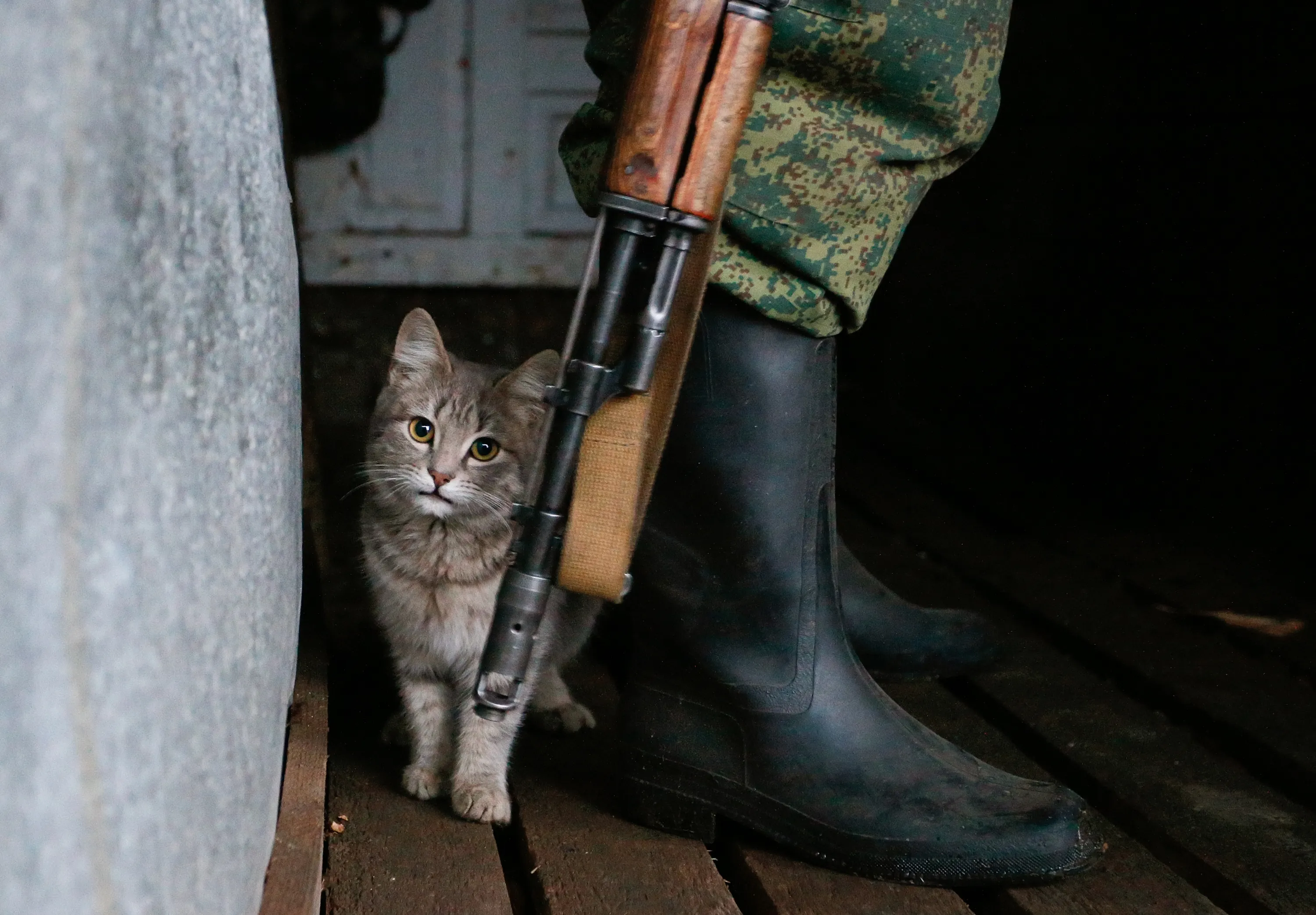 A cat stands behind a machine gun of a militant of the self-proclaimed Donetsk People's Republic (DPR) check the situation at the positions on a front line 25 km from pro-Russian militants controlled city of Donetsk, Ukraine, 23 January 2021. Six ceasefire violations were recorded in the area of the Joint Forces Operation (JFO) on 22 January, the press center of the Ukrainian JFO Command claimed in an update on 23 January 2021. (Photo by Dave Mustaine/EPA/EFE)