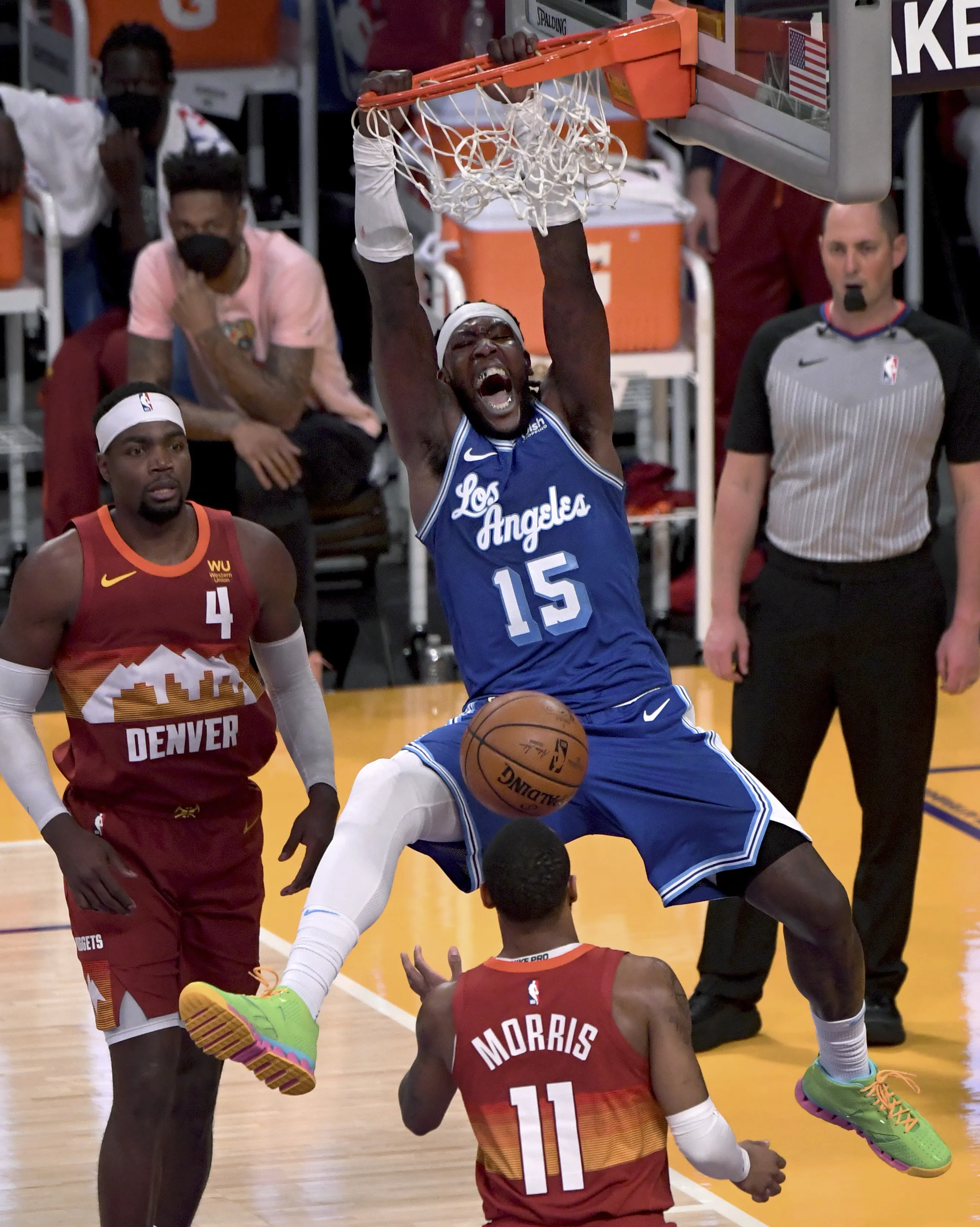 Los Angeles Lakers' Montrezl Harrell dunks against the Denver Nuggets during the second half of an NBA basketball game Thursday, February 4, 2021, in Los Angeles. (Photo by Keith Birmingham/The Orange County Register via AP Photo)