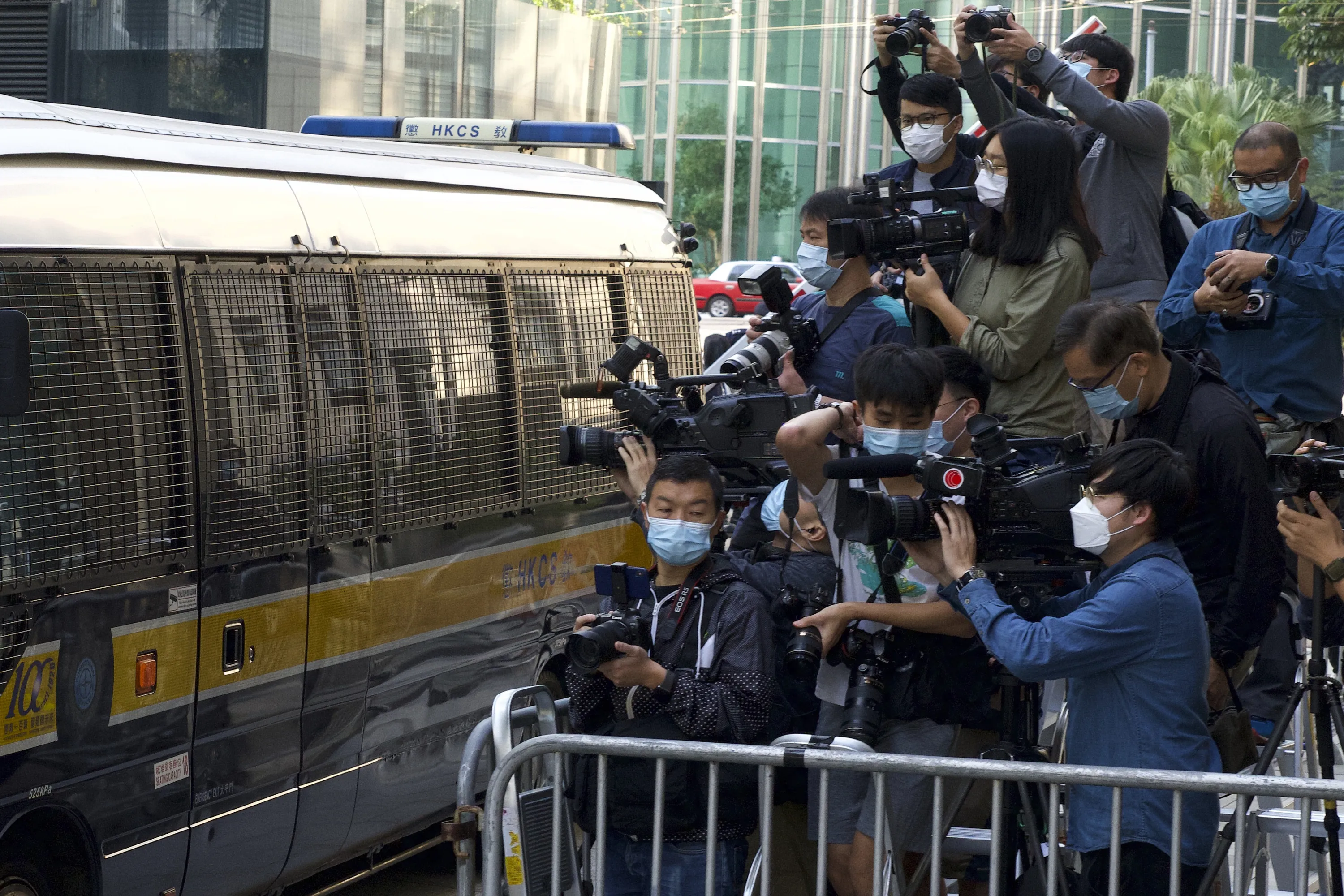 Photographers cover democracy advocate Jimmy Lai arriving at Hong Kong's Court of Final Appeal where the government is arguing against allowing him bail in Hong Kong Monday, February 1, 2021. Lai is charged with “collusion” under the new National Security Law that Beijing imposed on Hong Kong last year. (Photo by Vincent Yu/AP Photo)