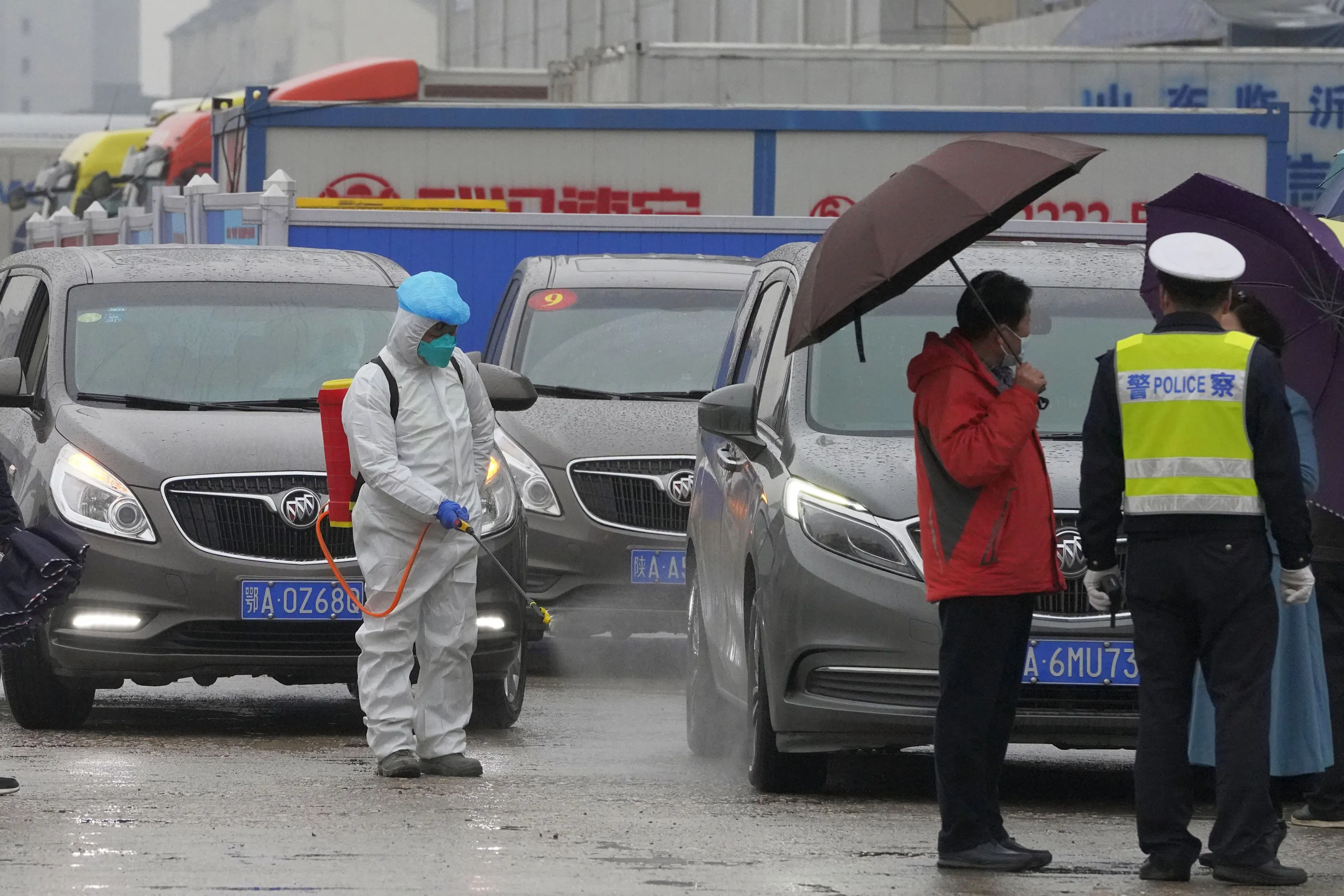 A worker in protective overall disinfects a vehicle from the World Health Organization convoy while they were visiting the Baishazhou wholesale market on the third day of field visit in Wuhan in central China's Hubei province on Sunday, January 31, 2021. (Photo by Ng Han Guan/AP Photo)
