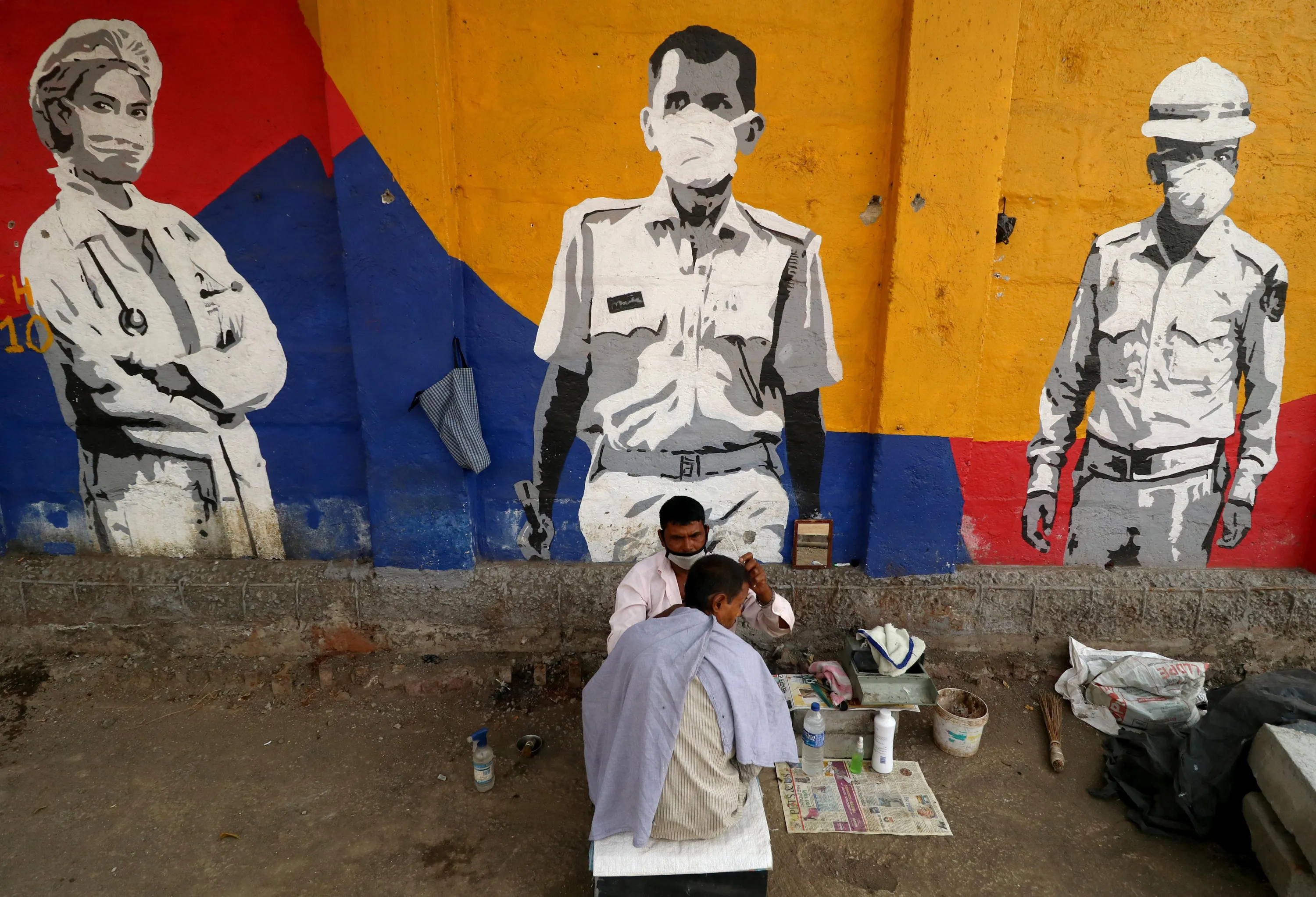 A roadside barber cuts the hair of a man in front of a wall with graffiti, amidst the spread of the coronavirus disease (COVID-19), in Mumbai, India, December 23, 2020. (Photo by Niharika Kulkarni/Reuters)