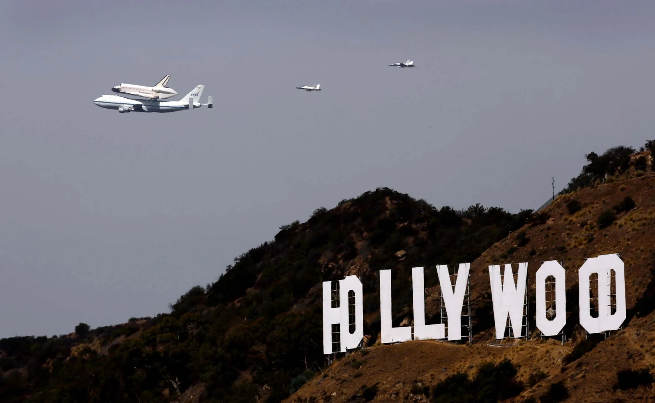 The space shuttle Endeavour passes the iconic Hollywood sign in Los Angeles. (Photo by Al Seib/Los Angeles Times/MCT)