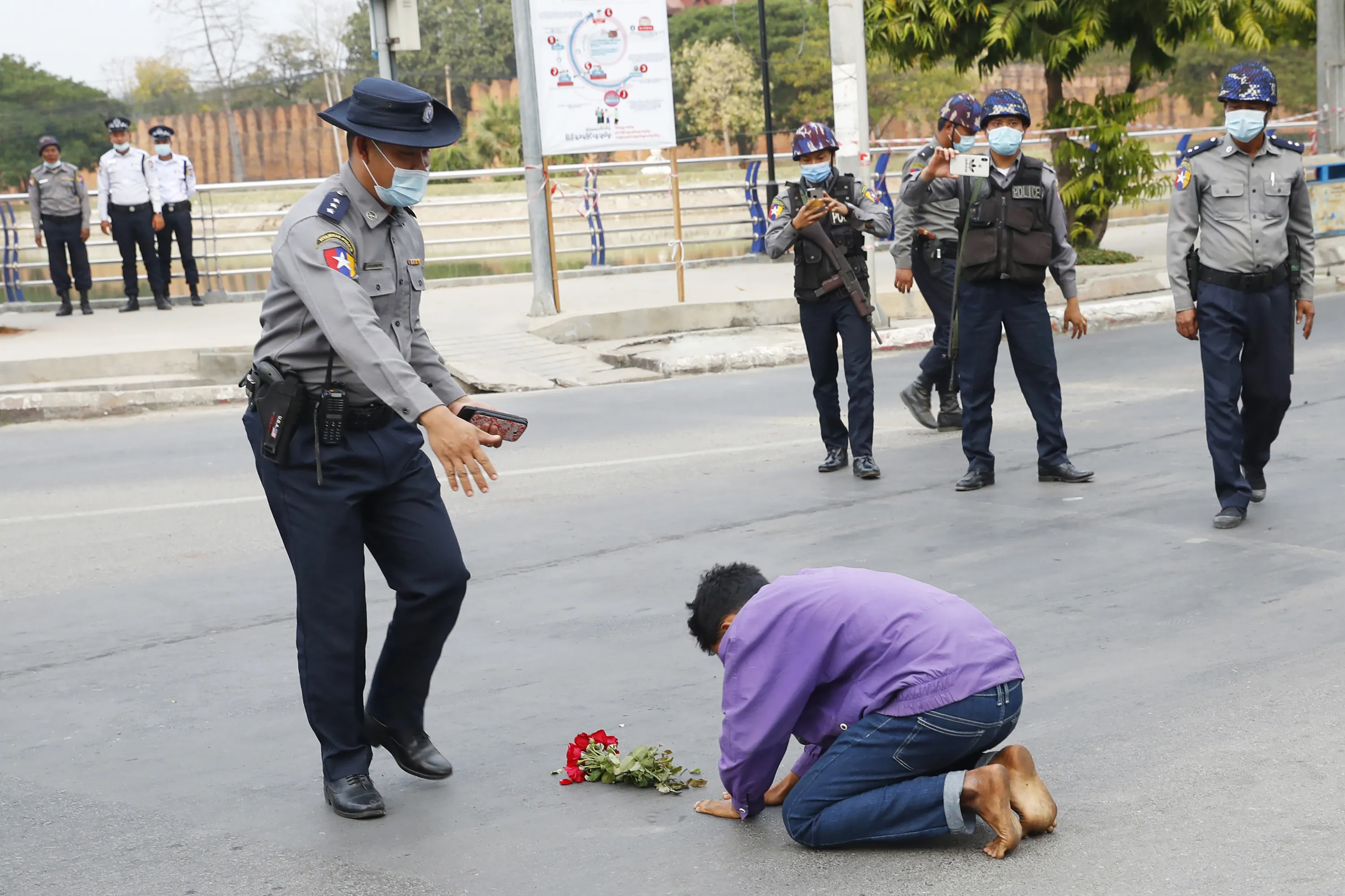 A protest supporter offers flowers and kneels on a road before a police officer in Mandalay, Myanmar, on February 6, 2021. Protests in Myanmar against the military coup that removed Aung San Suu Kyi’s government from power have grown in recent days despite official efforts to make organizing them difficult or even illegal. (Photo by AP Photo/Stringer)