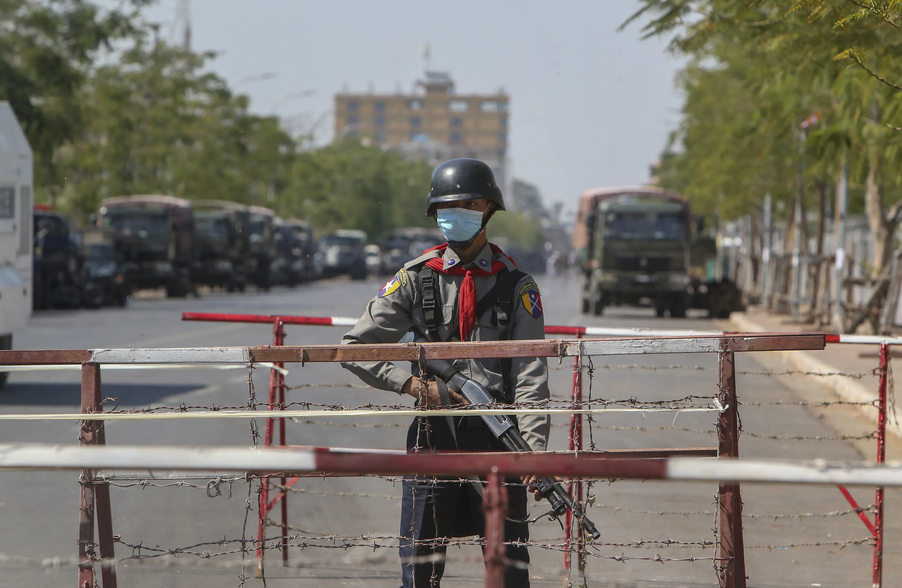 An armed police officer stands guard along a cordoned-off road with police vehicles and water cannons, the site of clashes a day earlier in Mandalay, Myanmar on Wednesday, February 10, 2021. Protesters continued to gather Wednesday morning in Mandalay breaching Myanmar's new military rulers' decrees that effectively banned peaceful public protests in the country's two biggest cities. (Photo by AP Photo/Stringer)