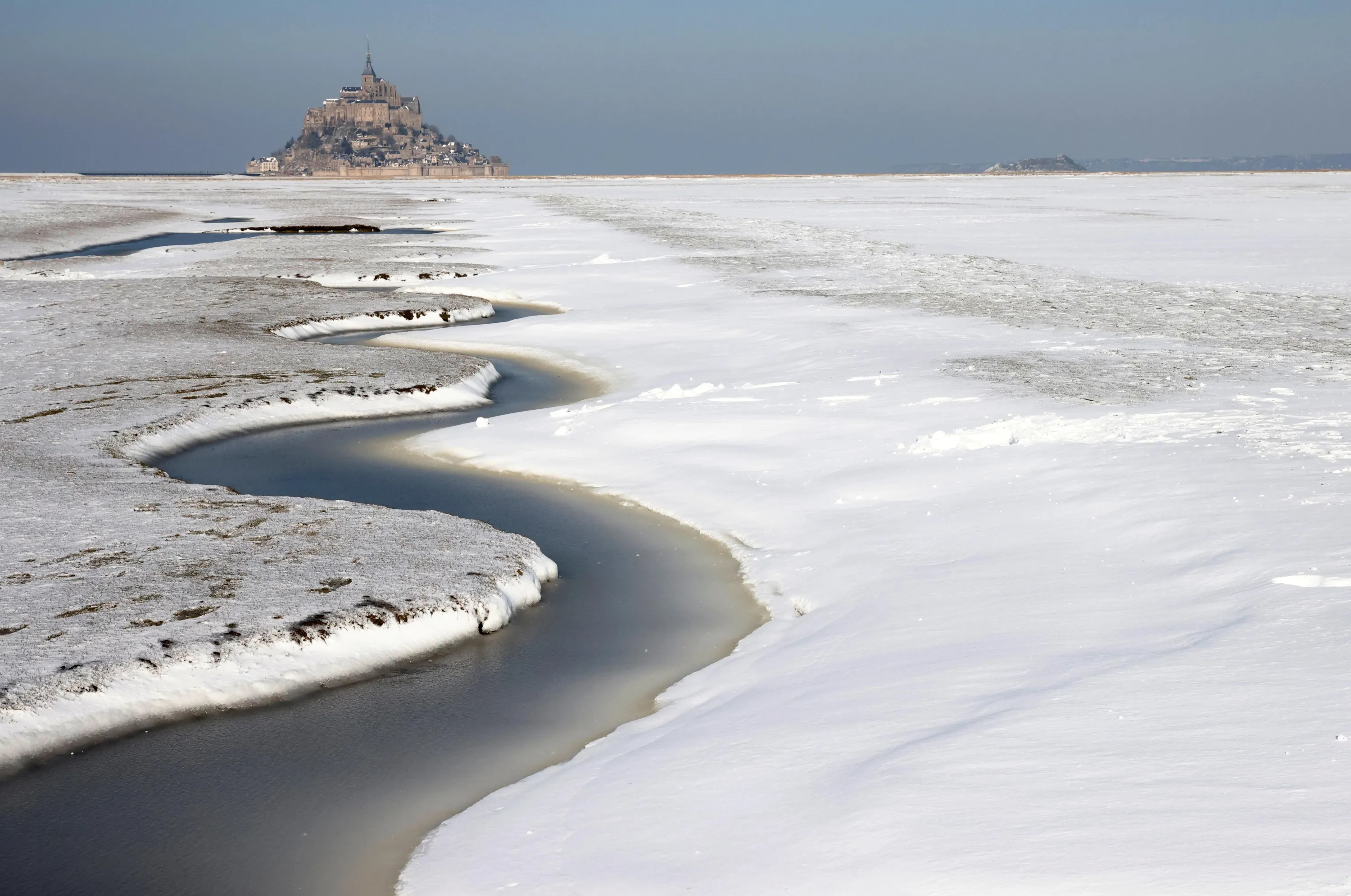 A view shows the snow-covered Bay of Mont Saint-Michel in the French western region of Normandy, as winter weather with snow and cold temperatures hits a large northern part of the country, France, February 10, 2021. (Photo by Stephane Mahe/Reuters)