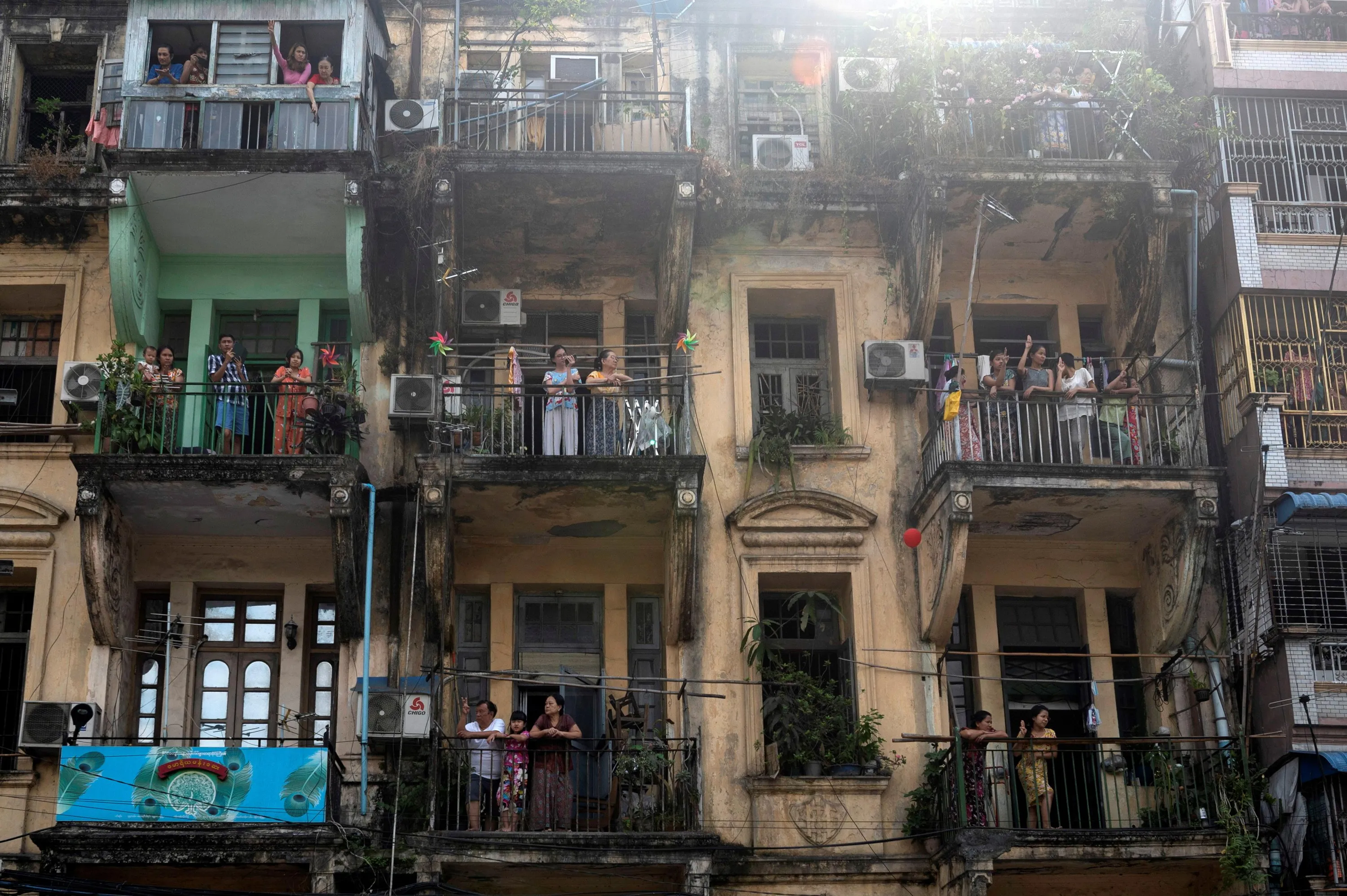 People watch from their balconies a protest against the military coup and demanding the release of elected leader Aung San Suu Kyi, in Yangon, Myanmar, February 7, 2021. (Photo by Reuters/Stringer)