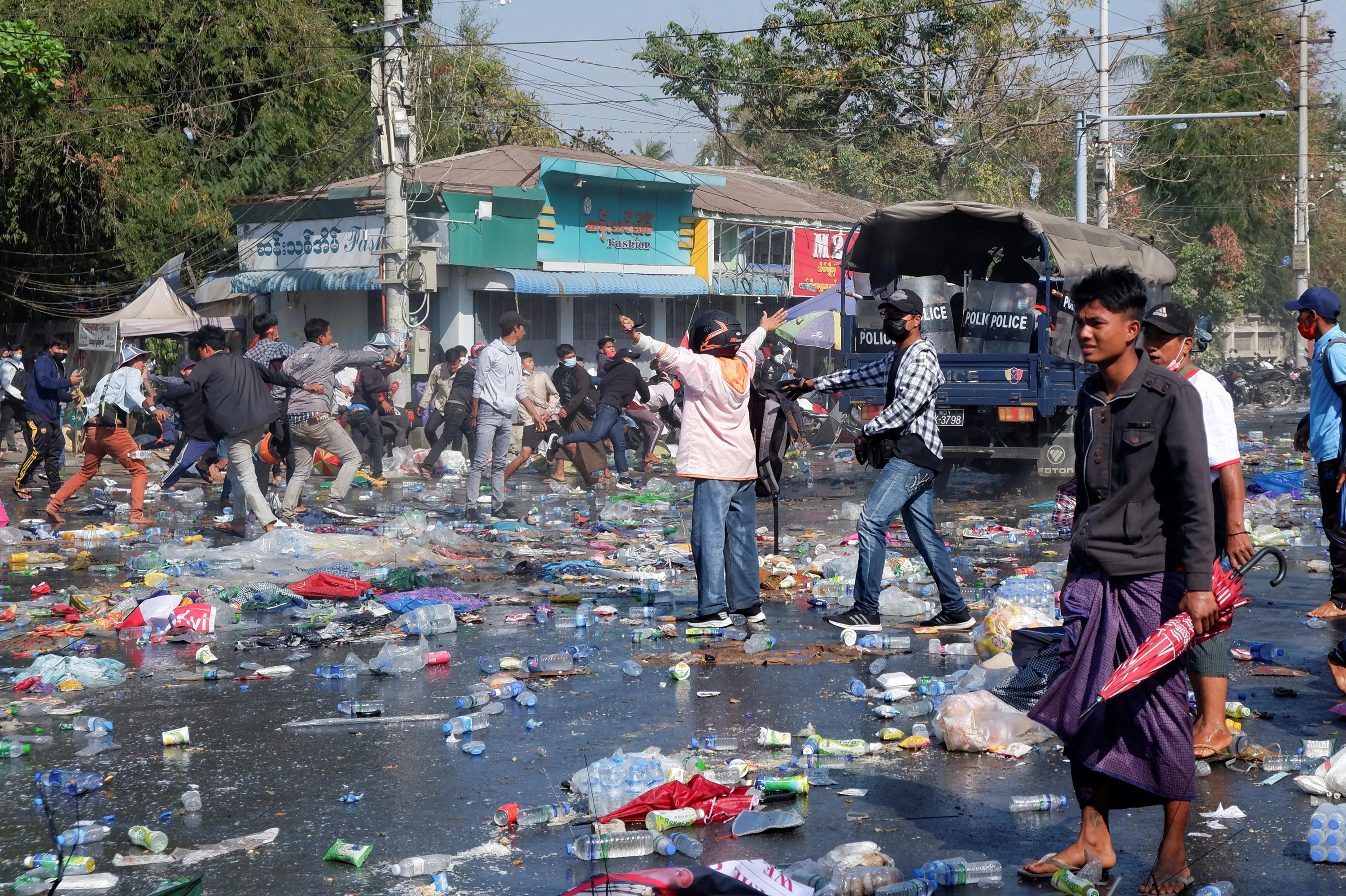Demonstrators riot against police as they protest against the military coup in Mandalay, Myanmar, February 9, 2021. (Photo by Reuters/Stringer)