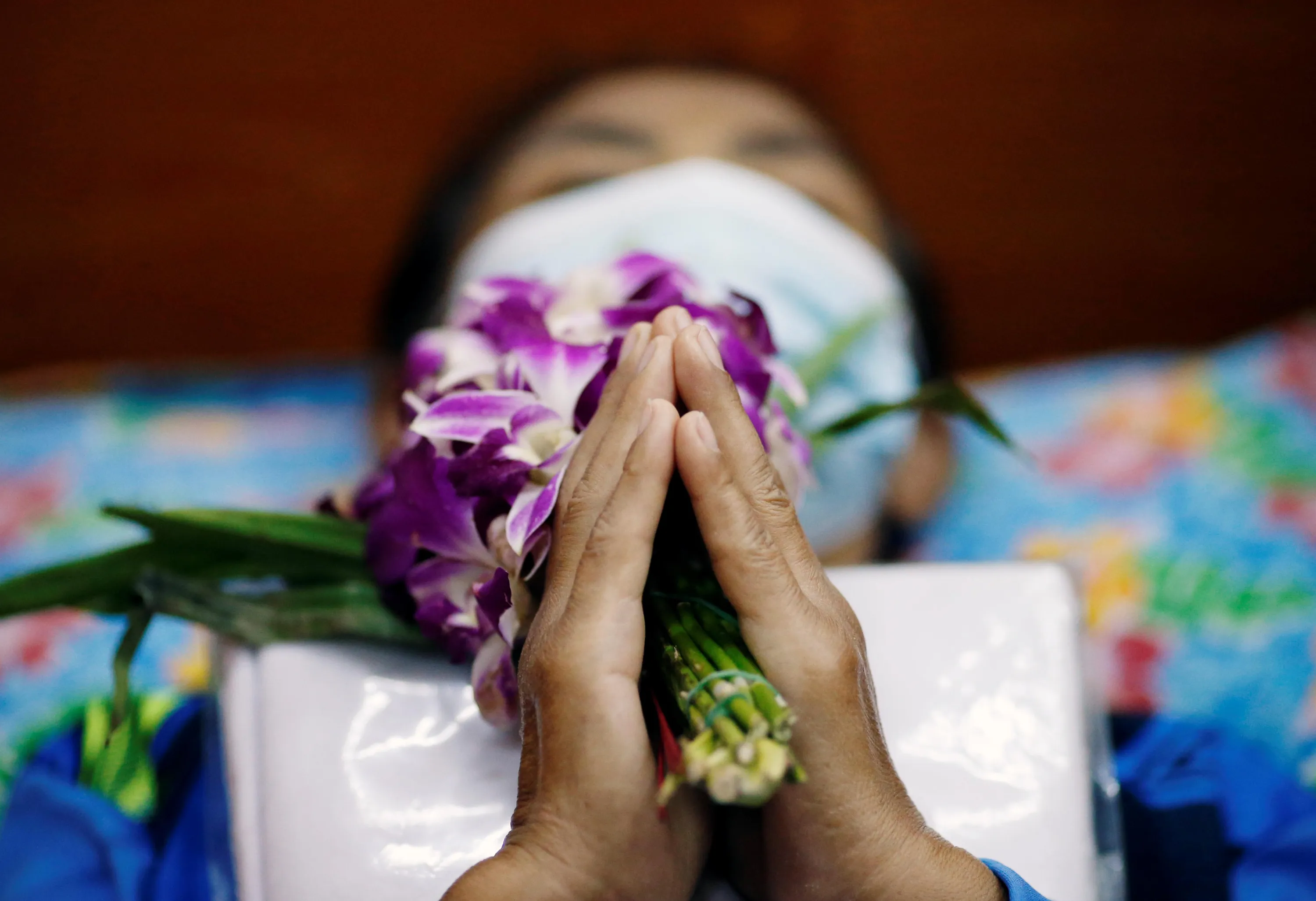 A devotee lies down and prays inside a coffin to trick death and improve luck at a temple in Bangkok, Thailand on January 27, 2021. (Photo by Soe Zeya Tun/Reuters)
