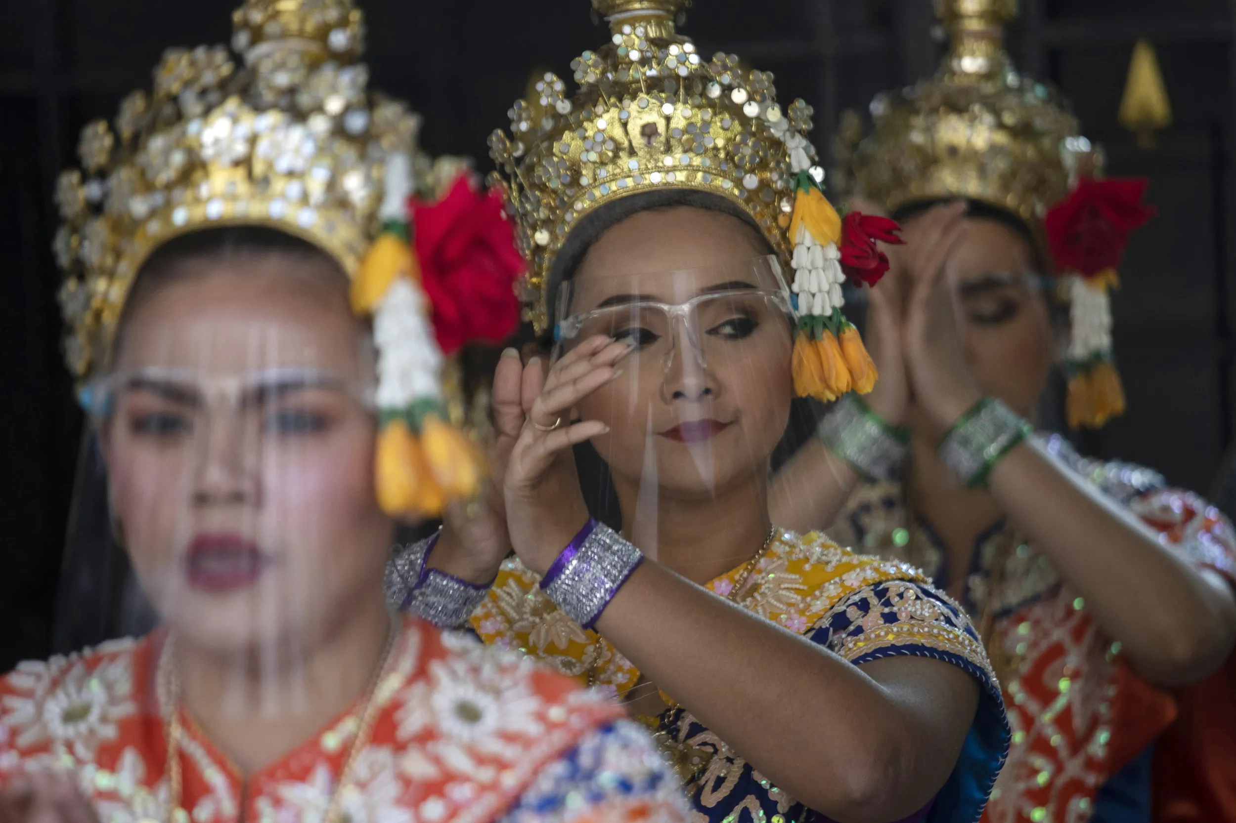 Thai classical dancers wearing face shields to help curb the spread of the coronavirus perform at the Erawan Shrine in Bangkok, Thailand, Tuesday, January 12, 2021. Thailand's government announced new measures, including partial lockdowns with strict travel restrictions in some areas. Schools, bars, gambling parlors and other public gathering places have been closed. (Photo by Sakchai Lalit/AP Photo)