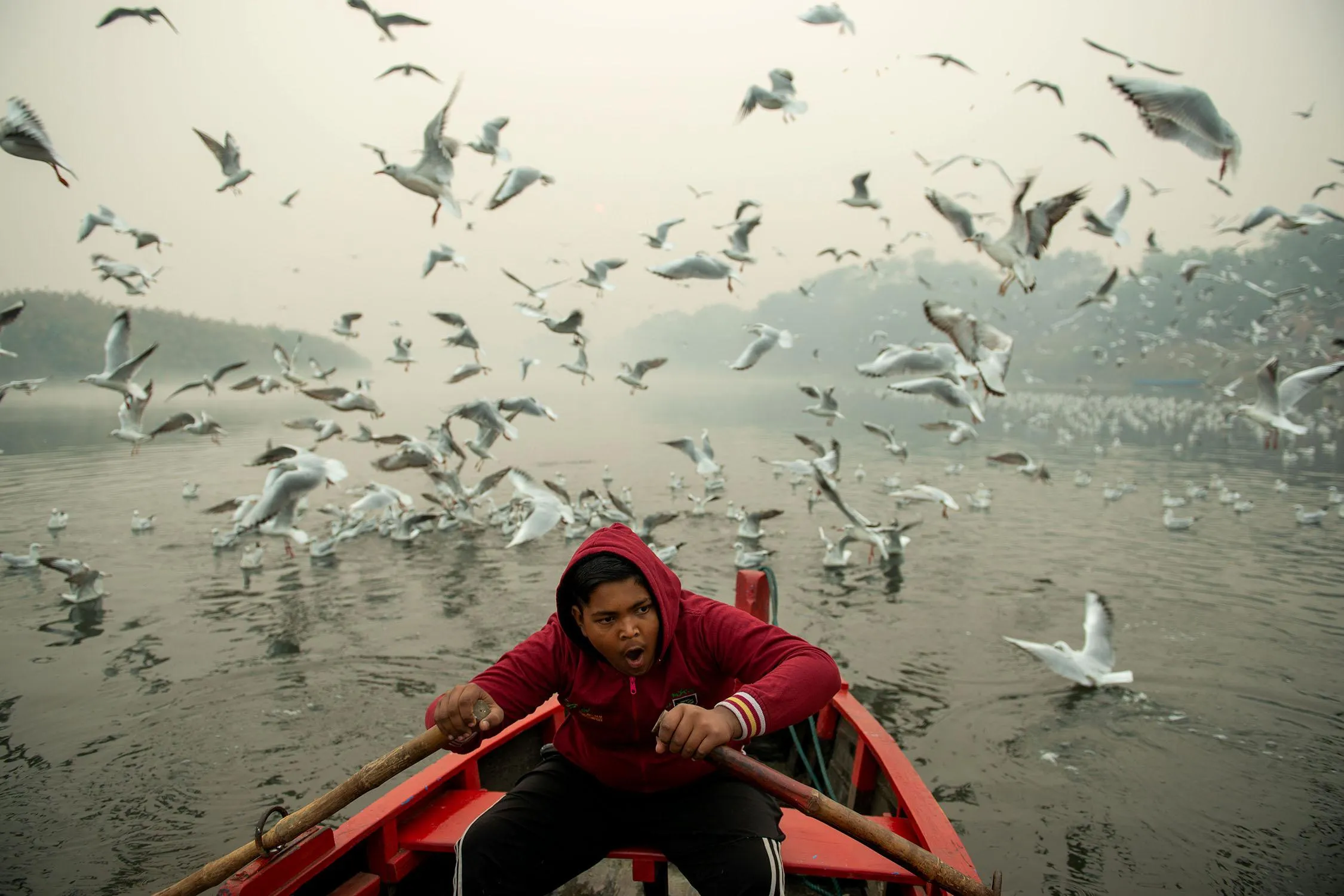 A man rides a boat as Seagulls fly over the waters of river Yamuna in New Delhi, India on November 8, 2020. A flock of Seagulls fly along the Yamuna River at Nigam Bodh Ghat. During the onset of winter season, flocks of Siberian seagulls migrate through Delhi making a temporary home at the river Ganga and Yamuna. This place is a haven for bird watchers and photographers. During morning hours birds are often fed by devotees who arrive to bathe at the river. (Photo by Pradeep Gaur/SOPA Images/LightRocket via Getty Images)