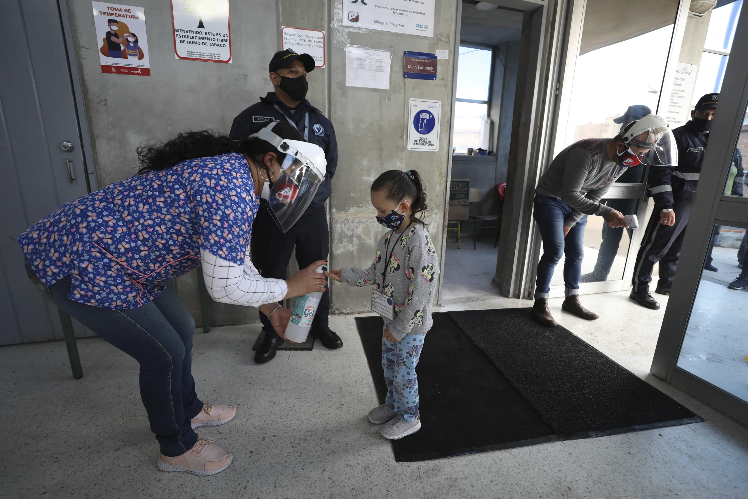 A teacher gives anti-bacterial gel to a preschool student on the first day back to in-person class amid the COVID-19 pandemic in Bogota, Colombia, Monday, February 15, 2021. Bogota is returning students to blended classes at public schools after a year of online education due to the pandemic. (Photo by Fernando Vergara/AP Photo)