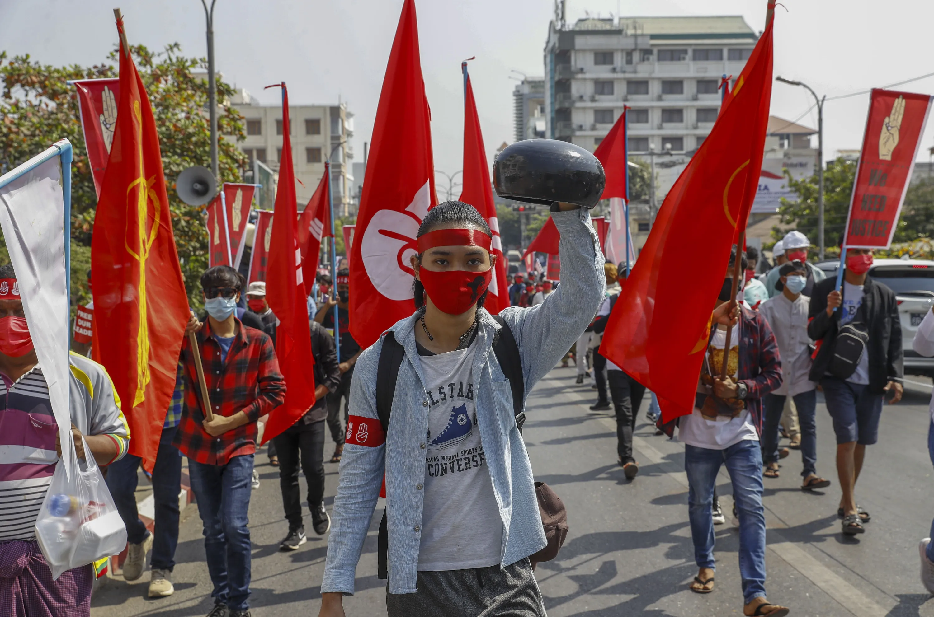 A demonstrator displays an upside-down begging-bowl, a form of protest symbolizing refusal to receive any kind of alms from the military government during a protest against the military coup in Mandalay, Myanmar on Tuesday, February 16, 2021. Security forces in Myanmar pointed guns toward anti-coup protesters and attacked them with sticks Monday, seeking to quell the large-scale demonstrations calling for the military junta that seized power this month to reinstate the elected government. (Photo by AP Photo/Stringer)