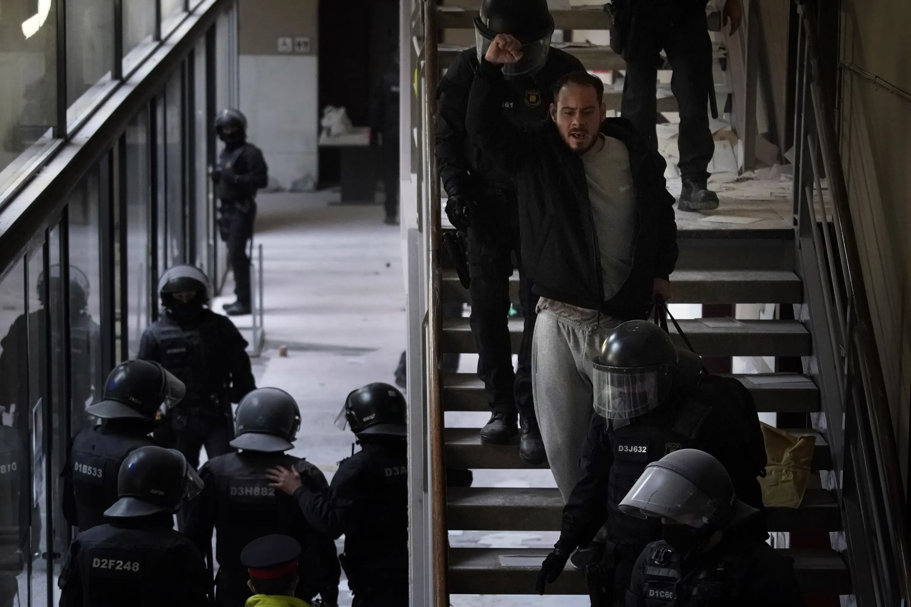 Rap singer Pablo Hasél is detained by police officers at the University of Lleida, Spain, Tuesday, February 16, 2021. A 24-hour standoff between police and a rapper barricaded with dozens of his supporters in a university ended with the arrest of the artist, who has been sentenced to 9 months in prison for insulting the monarchy and praising terrorism. (Photo by Joan Mateu/AP Photo)