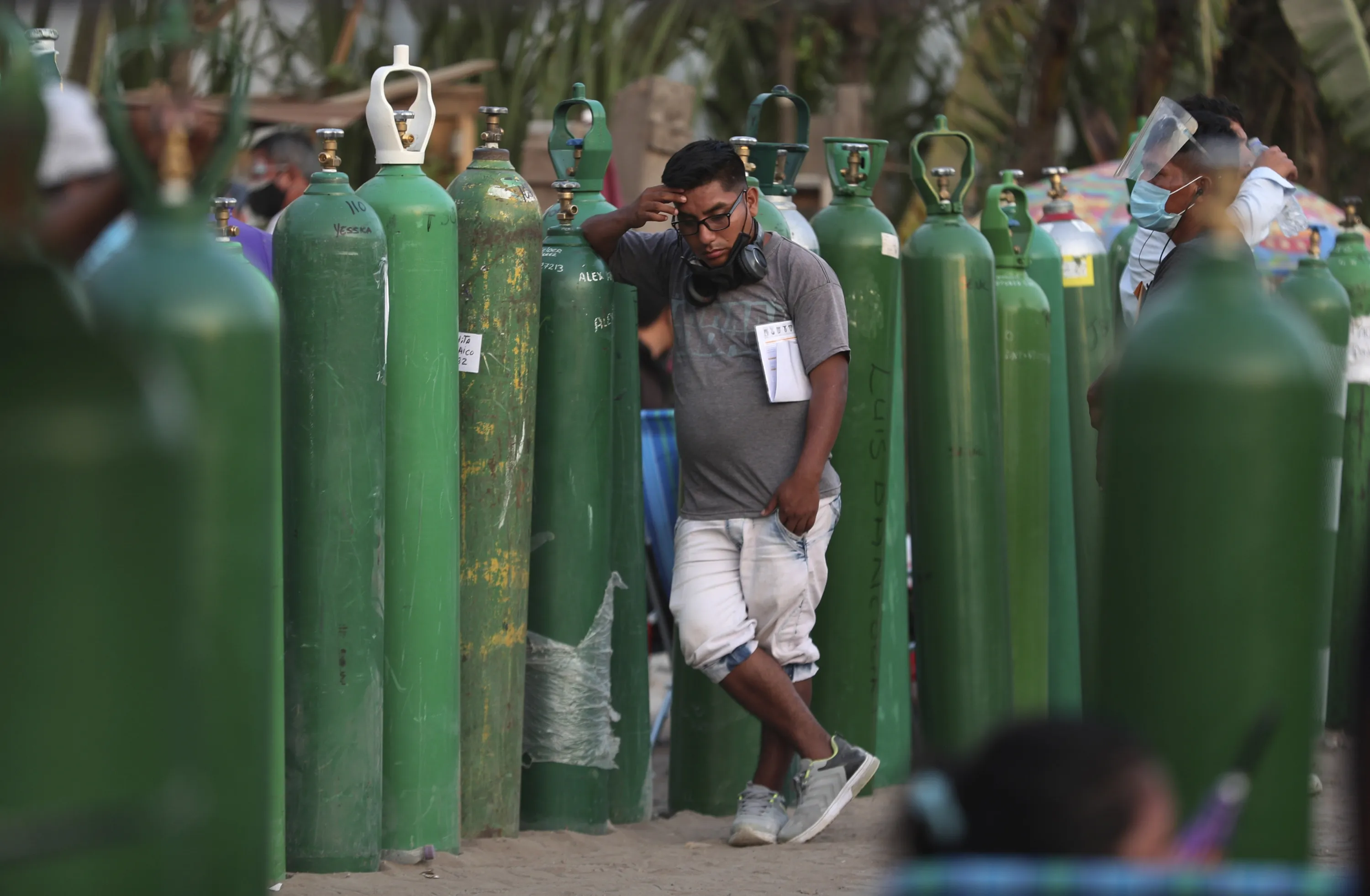 Juan Abanto rests next to his empty oxygen tank as he waits for a refill at a shop that has already closed for the day and will open again tomorrow, in the poor area of Villa El Salvador, in Lima, Peru, Monday, February 15, 2021, amid the COVID-19 pandemic. Some of the people in line said they have been waiting for two days for refills and are now staying for a third day in an attempt to procure oxygen for their sick relatives. (Photo by Martin Mejia/AP Photo)