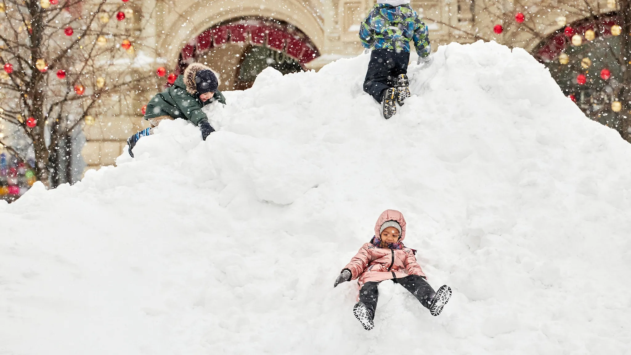 Children play in a snowdrift during a heavy snowfall at the Red square on February 13, 2021 in Moscow, Russia. A record-breaking snowstorm descended on Moscow on February 12, paralysing traffic, grounding flights and straining efforts of local authorities to respond to the “snow apocalypse”. (Photo by Oleg Nikishin/Getty Images)
