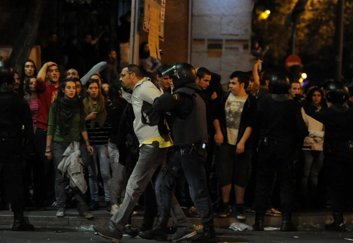 Riot policemen arrest a protester during a demonstration organized by Spain's "indignant" protesters to decry an economic crisis they say has "kidnapped" democracy, on September 25, 2012 in Madrid. Spanish riot police fired rubber bullets and baton-charged protesters as thousands rallied near parliament in Madrid in anger at the government's handling of the economic crisis. AFP PHOTO / DOMINIQUE FAGET (Photo credit should read DOMINIQUE FAGET/AFP/GettyImages)
