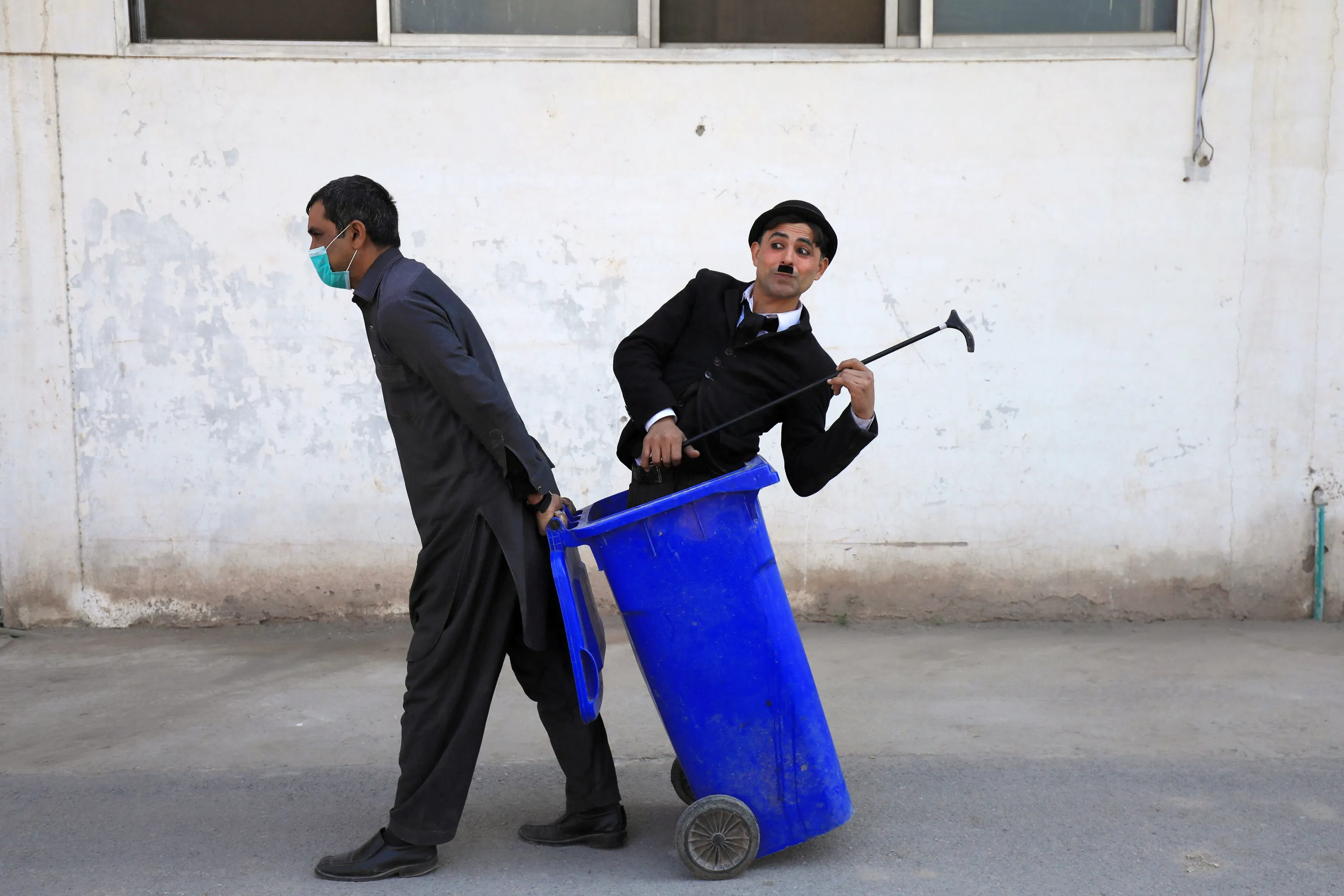 A man pulls a bin with Usman Khan, 29, dressed up as Charlie Chaplin during a street performance in Peshawar, Pakistan on January 28, 2021. (Photo by Fayaz Aziz/Reuters)