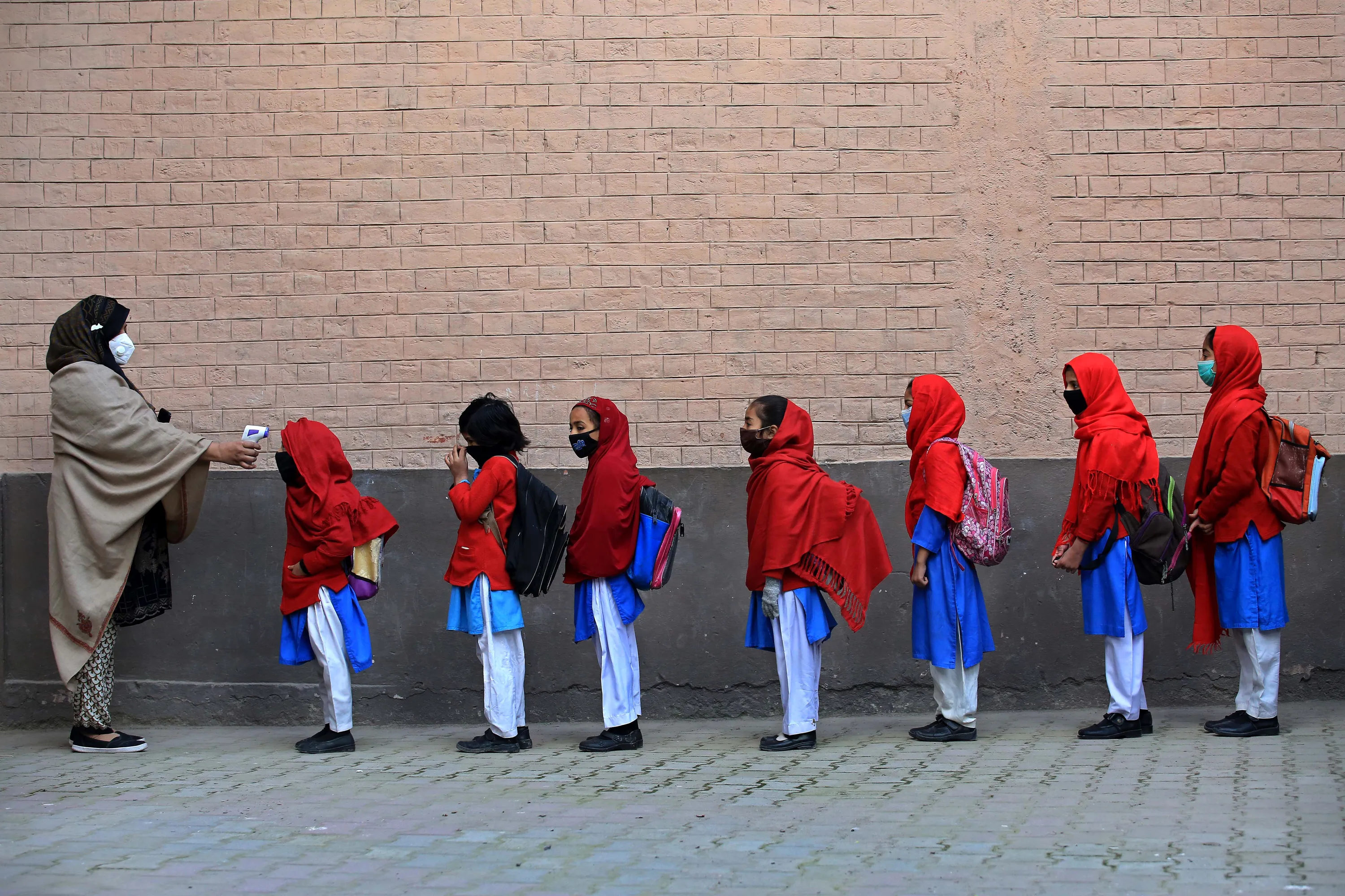 School staff check the temperatures of students as they arrive on the first day of primary school, after the resumption of classes in Peshawar, Pakistan, 01 February 2021. The Pakistani government, on 01 February, reopened educational institutions to resume Pre-primary and primary classes as part of a phased reopening of schools as cases of COVID-19 infections continue to decline in the country. (Photo by Bilawal Arbab/EPA/EFE)
