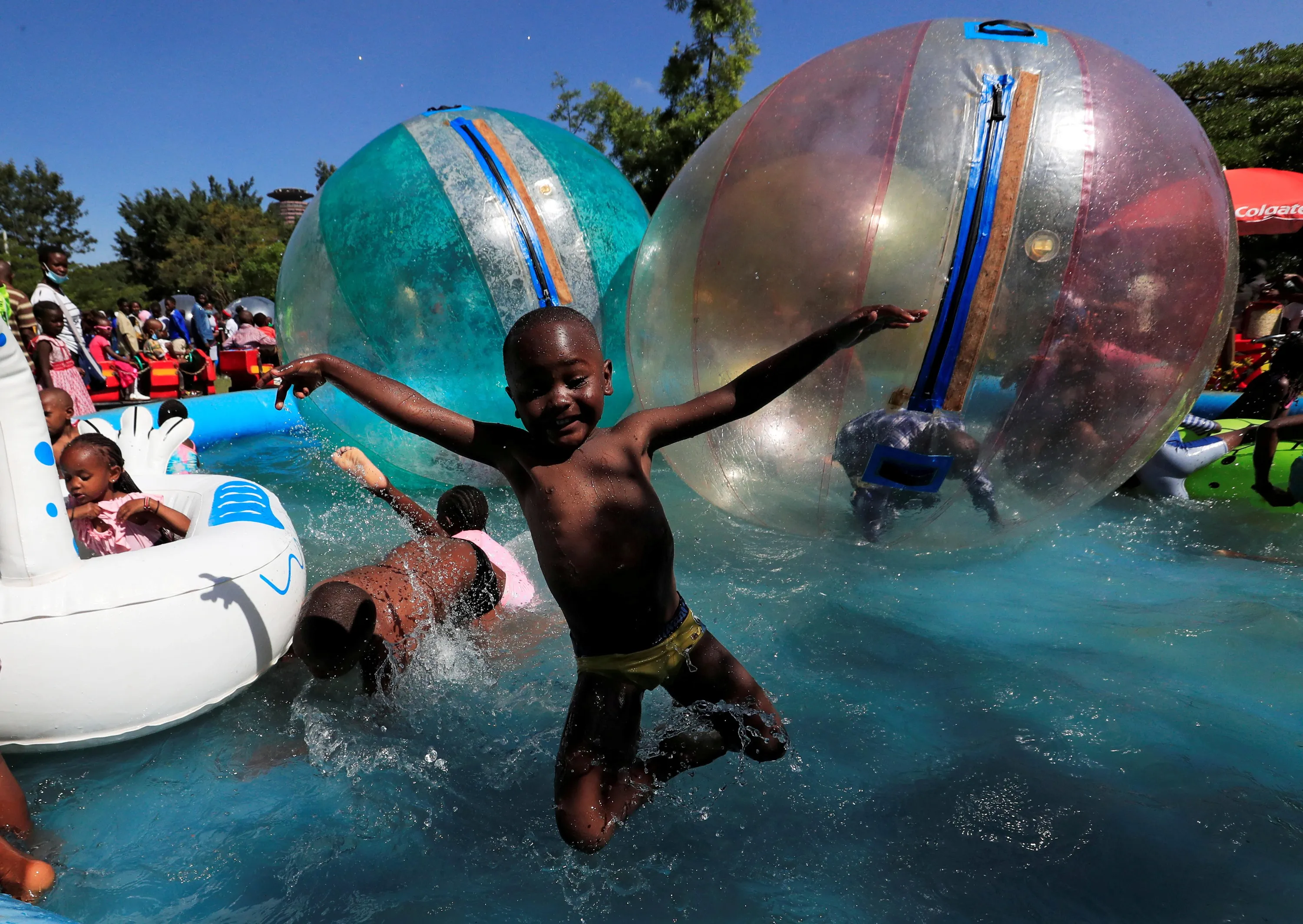 A child jumps in the portable swimming pool at the Uhuru Park grounds for Christmas Day celebrations in Nairobi, Kenya on December 25, 2020. (Photo by Thomas Mukoya/Reuters)