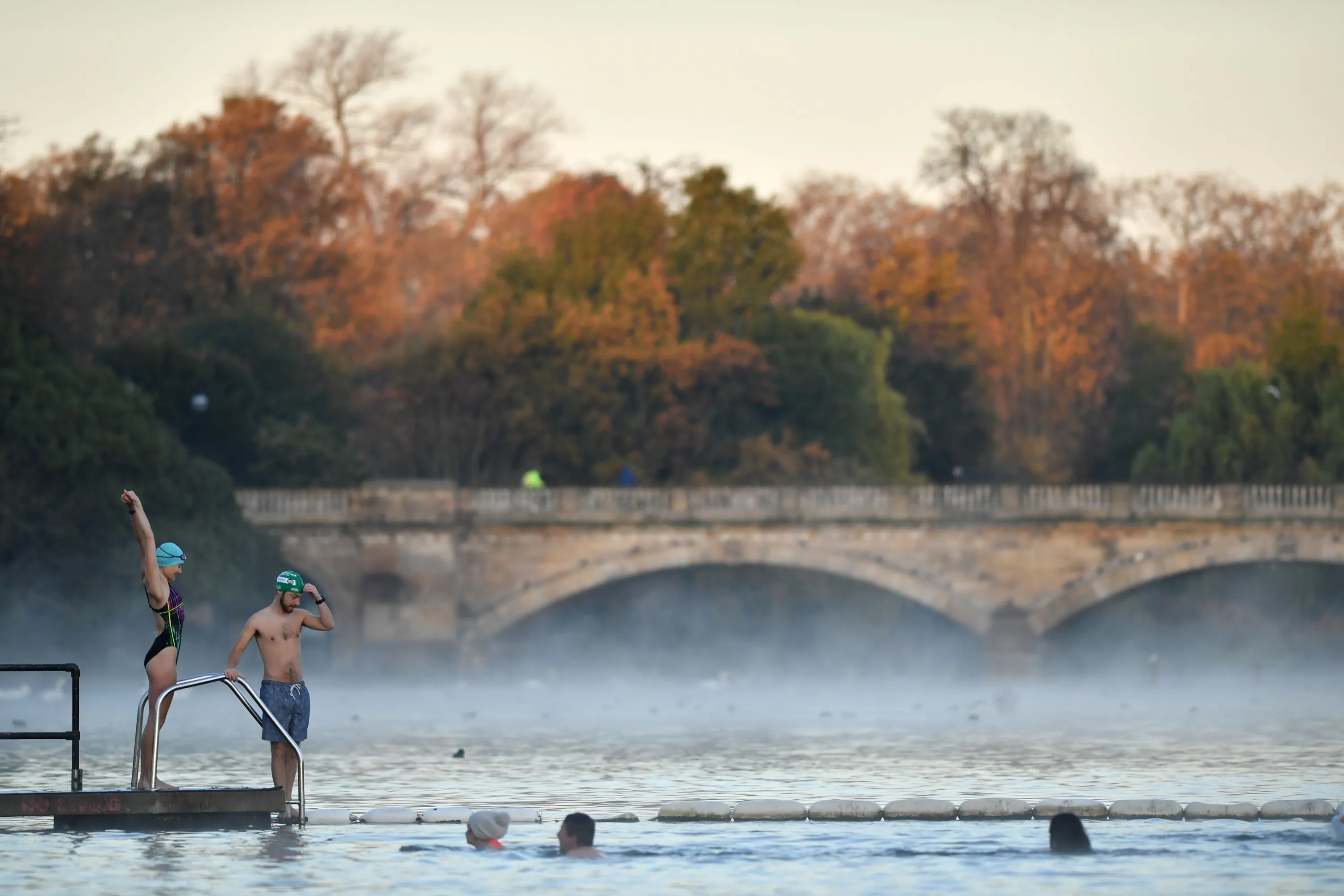 Bathers prepare to swim in the Serpentine in Hyde Park, London on November 4, 2020. England heads into a second national lockdown tomorrow to try to cut coronavirus cases. (Photo by Glyn Kirk/AFP Photo)