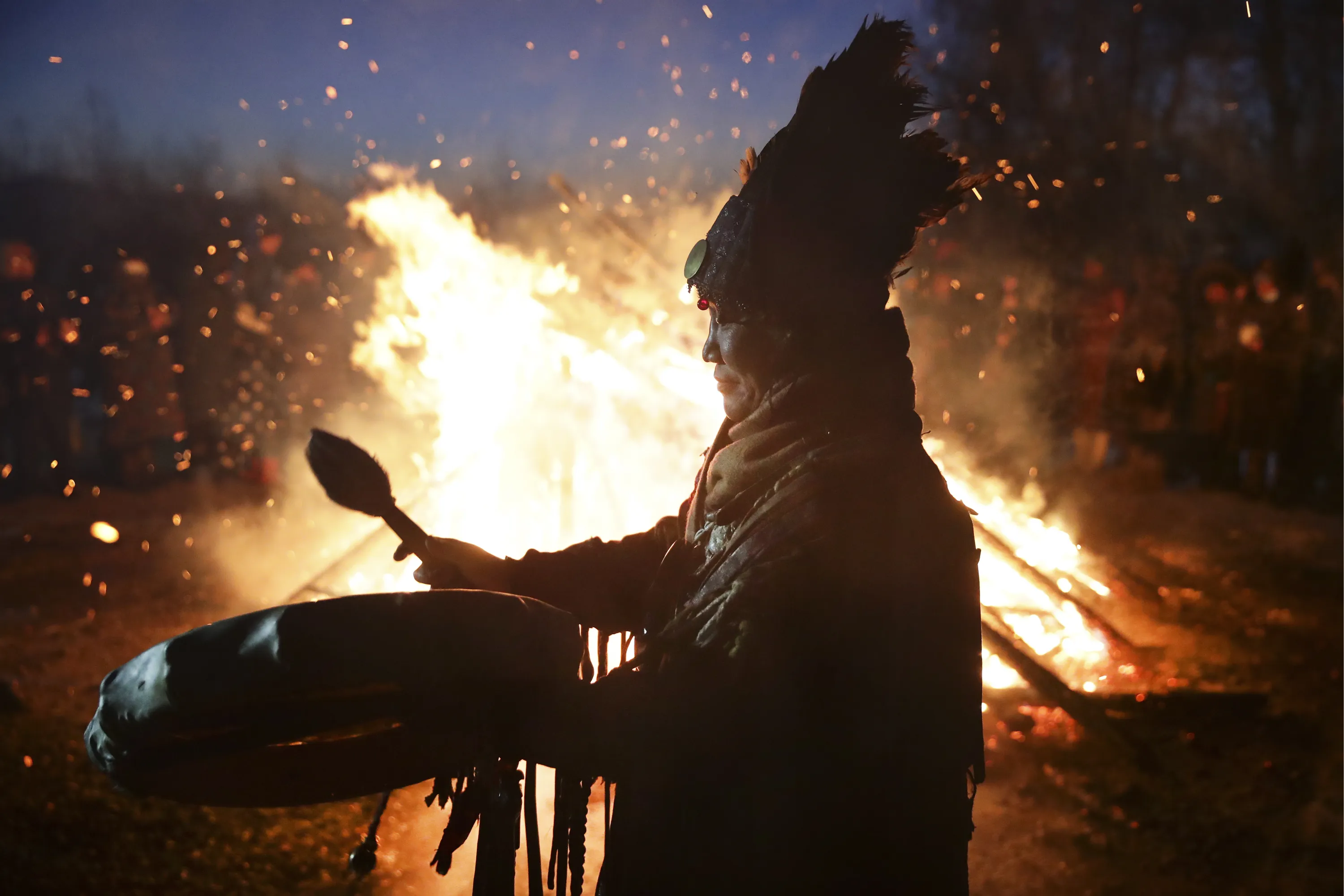A shaman conducts San Salyr, a sacred fire lighting rite, during celebrations of Shagaa, the Lunar New Year, in National Park in Tyva Republic, Russia on February 12, 2021. Lunar New Year 2021 is the Year of the Ox. (Photo by Kirill Kukhmar/TASS)