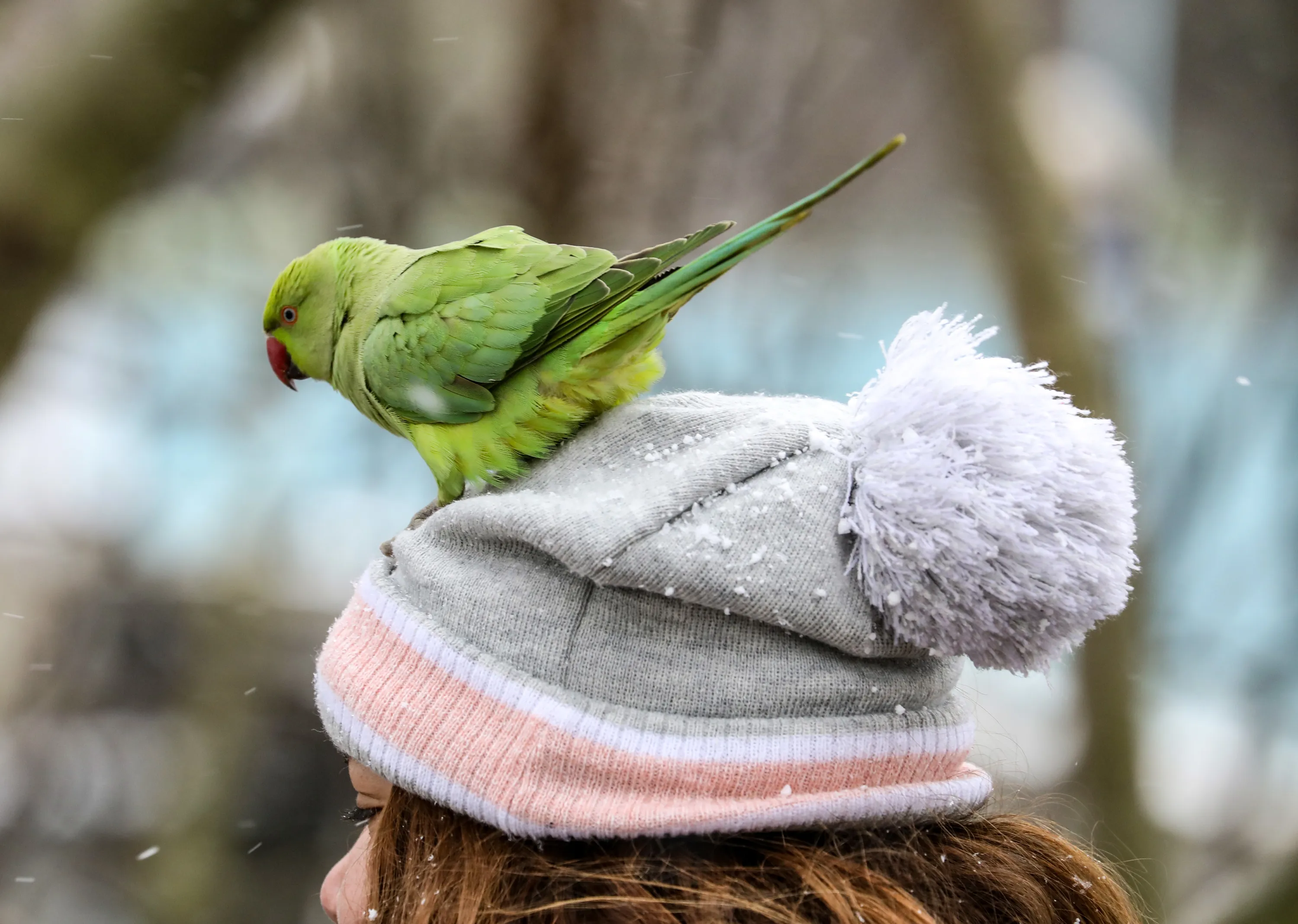 A parakeets lands on a woman's head at St James' Park in London, United Kingdom on February 9, 2021. London has been experiencing snow as the Storm Darcy hits the city. (Photo by Brett Cove/SOPA Images/Sipa USA)