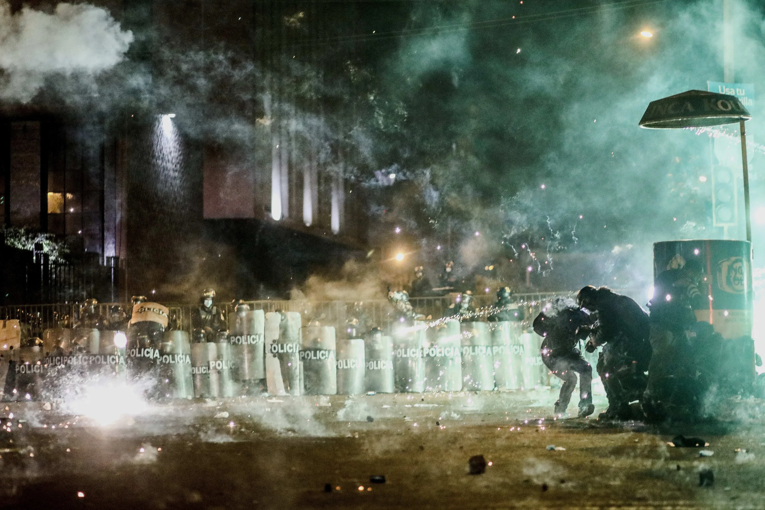 Police officers fire tear gas canisters at demonstrators during a protest against Peruvian President Manuel Merino at Plaza San Martin in Lima, Peru, 12 November 2020. Merino took office on 10 November amid a controversial constitutional process after the dismissal of former President Martin Vizcarra for “moral incapacity” by Peruvian Congress. (Photo by Aldair Mejia/EPA/EFE)
