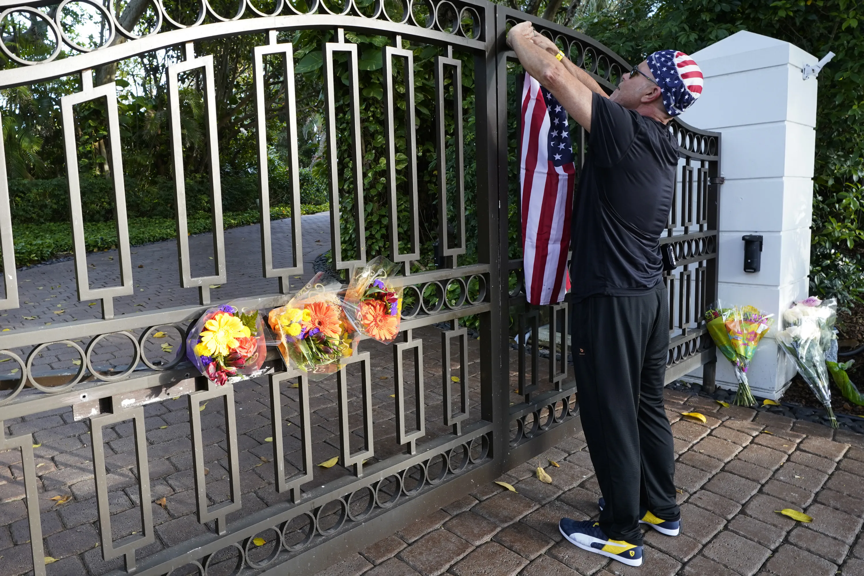 John Hensel attaches an American flag to the gate of the home of his friend and talk radio host Rush Limbaugh, Wednesday, February 17, 2021, in Palm Beach, Fla. Limbaugh, 70, died this morning of lung cancer. (Photo by Marta Lavandier/AP Photo)