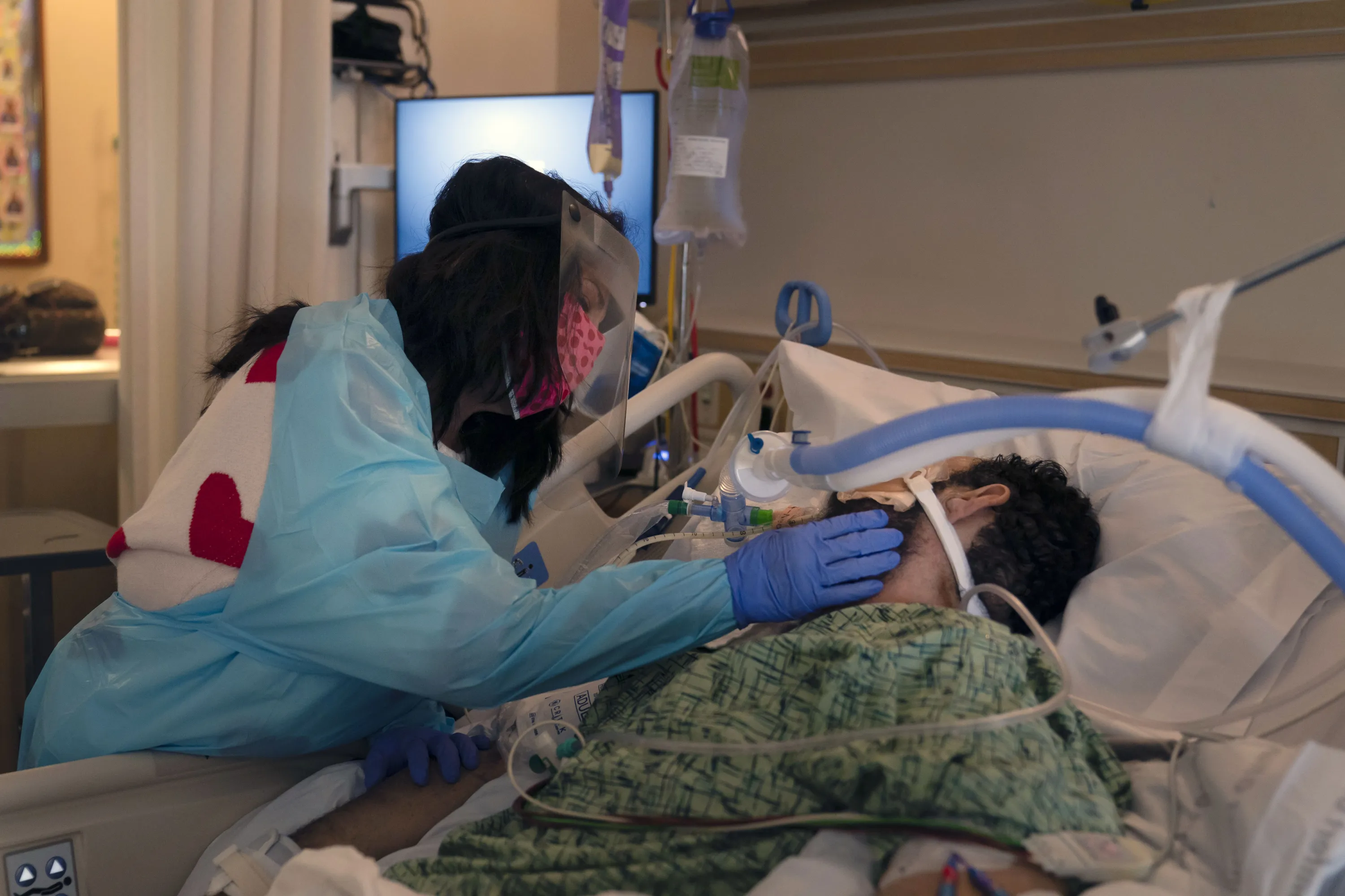 Patty Trejo, 54, touches the face of her intubated husband, Joseph, in a COVID-19 unit at St. Jude Medical Center, in Fullerton, Calif., Monday, February 15, 2021. Trejo visited her husband Monday for the first time since he was hospitalized more than a month ago. A survivor of COVID-19 herself, she invited a mariachi band to give him courage. Surrounded by hospital staff, family members and friends in the parking lot of the hospital, the band played her husband's favorite song, “La mano de Dios”, or “The Hand of God”. “He needs to know that I still love him, and he needs to know he's got to fight”, said Trejo. (Photo by Jae C. Hong/AP Photo)